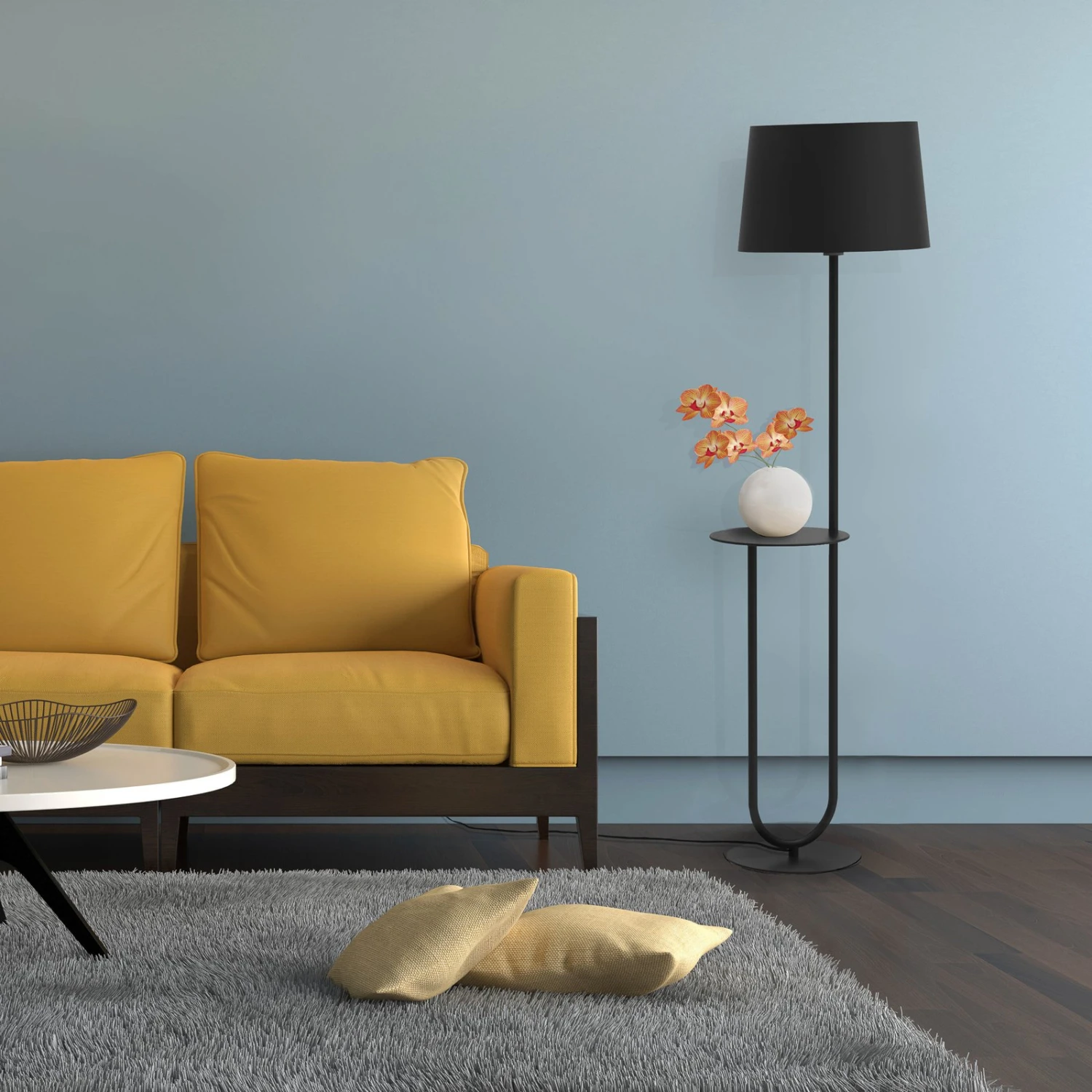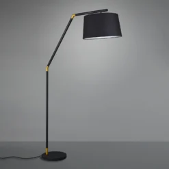 Lampada da terra tessile Duo: fonte di luce e contenitore in uno La lampada da terra Duo dimostra la sua elevata funzionalità in due ambiti: da un lato, fornisce un’illuminazione diffusa e d’atmosfera grazie al paralume in chintz nero, dall’altro, è dotata di un piccolo piano d’appoggio a metà altezza, su cui è possibile appoggiare, ad esempio, un libro o dei giornali. La fonte di luce ideale per un’accogliente zona salotto o per la zona notte. Con l’interruttore sul cavo di alimentazione