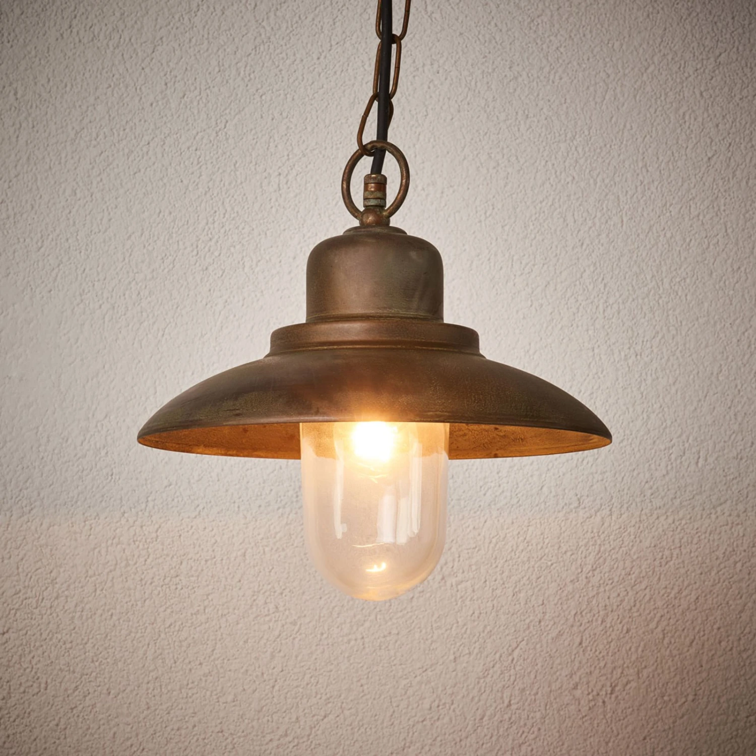 Efficace lampada a sospensione Palermo con paralume di grandi dimensioni La lampada a sospensione Palermo è dotata di un paralume di grandi dimensioni in ottone anticato, sotto il quale è fissato un vetro protettivo trasparente. Appeso a una robusta catena, ha un aspetto rustico. Allen è una lampada a sospensione di alta qualità, protetta dagli spruzzi d’acqua e dalle particelle di polvere grazie al grado di protezione IP43, che la rende adatta anche agli ambienti esterni coperti.