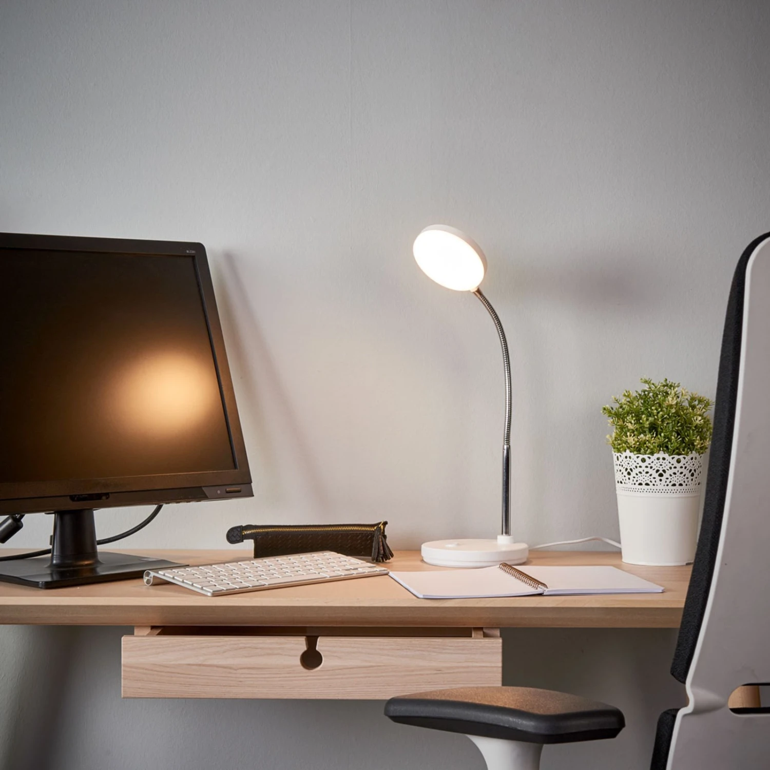 Lampada da scrivania a LED Milow in bianco e cromo Ogni casa ben attrezzata dovrebbe avere una lampada da scrivania e questa è un’ottima raccomandazione, non da ultimo per l’attacco a LED, che fornisce una fonte di luce a risparmio energetico. La testa e la base della lampada da scrivania a LED sono bianche, mentre il braccio flessibile intermedio è cromato, creando un piacevole contrasto estetico. Dal punto di vista funzionale, il braccio flessibile consente di spostare la testa piatta e circolare della lampada a seconda delle esigenze e di creare una situazione di illuminazione indiretta, se lo si desidera. L’interruttore a levetta della lampada da scrivania a LED Milow si trova direttamente sulla base della lampada, per un rapido utilizzo.