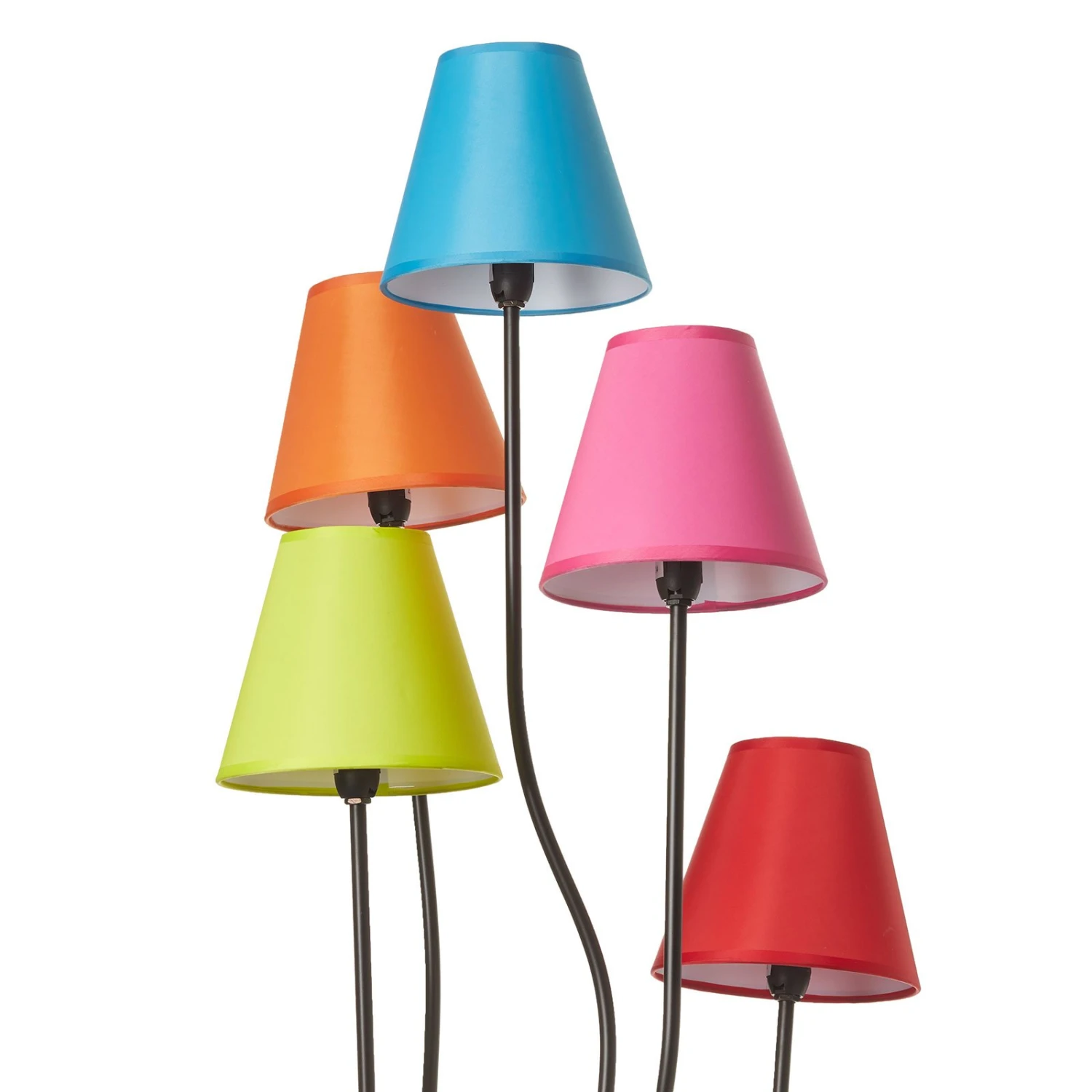 Accattivante lampada da terra in tessuto Colori con paralumi coloratiGli intrecci dei montanti metallici fanno già capire che la lampada da terra Colori va in una direzione vivace e moderna. Il punto forte, nel vero senso della parola, sono i cinque paralumi tessili colorati sfalsati. Scegliendo una potente lampadina E14, la lampada da terra Colori è ideale come richiamo visivo colorato in soggiorni, sale da pranzo e camere da letto dal design fresco e moderno.