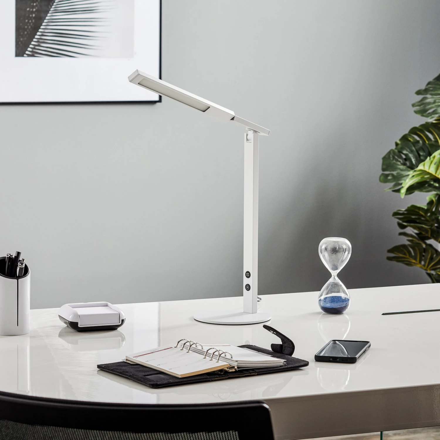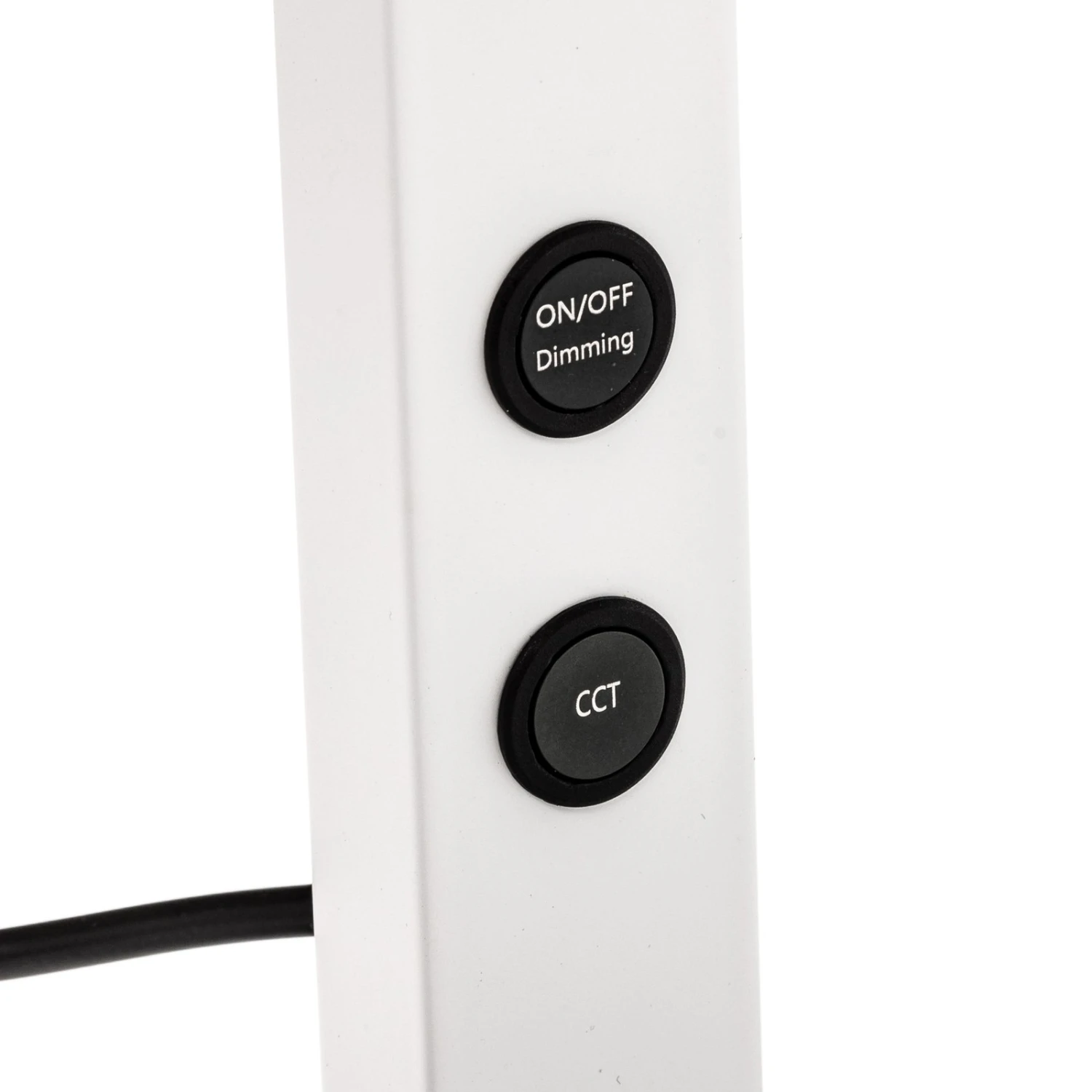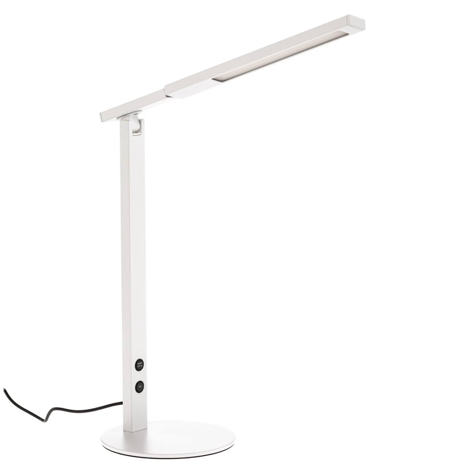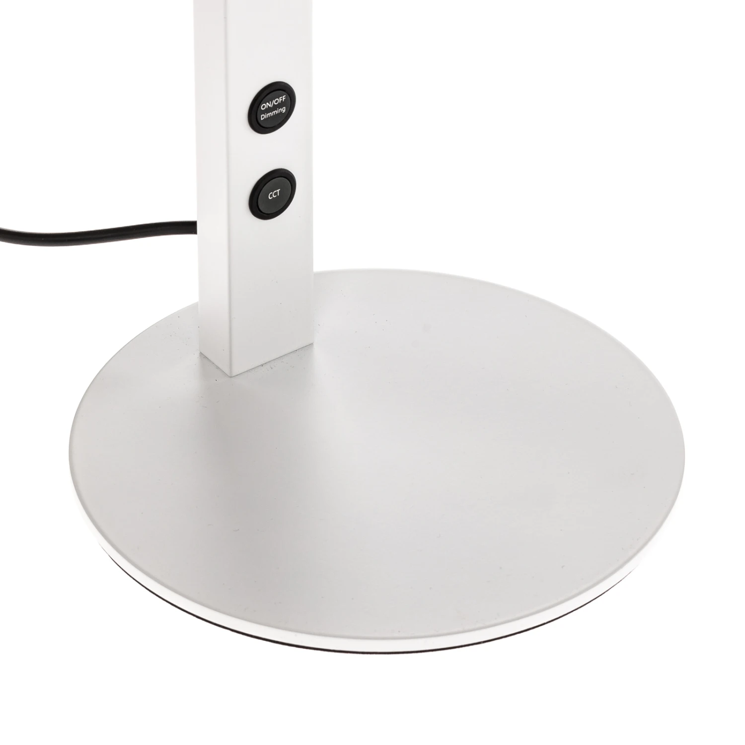 Sul tavolo dello studio o del soggiorno moderno, la lampada da tavolo a LED Ideal è una fonte di luce flessibile. La struttura in alluminio è ridotta all’essenziale; un’asta verticale emerge da una base rotonda e sostiene un braccio inclinabile. Il suo lato inferiore è dotato di LED. La barra inferiore è dotata di due interruttori manuali, che vengono utilizzati per il controllo della luminosità a cinque stadi e la selezione a tre stadi del colore della luce dal bianco caldo al bianco universale.