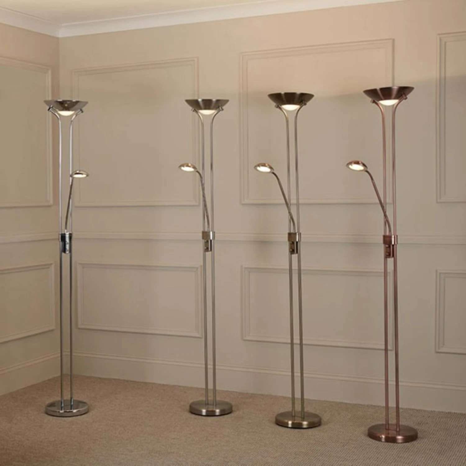 L’uplighter Mother & Child offre due tipi di illuminazione: il paralume superiore illumina la luce bianca calda verso il soffitto, il piccolo braccio aggiuntivo fornisce luce per leggere o fare lavori manuali. Entrambe le sorgenti luminose possono essere commutate separatamente e sono entrambe dimmerabili, in quanto nel telaio sono integrati due interruttori rotanti/dimmer. In questo modo la luce può sempre essere commutata in modo appropriato, sia che sia veramente luminosa o leggermente attenuata per un ambiente accogliente.
