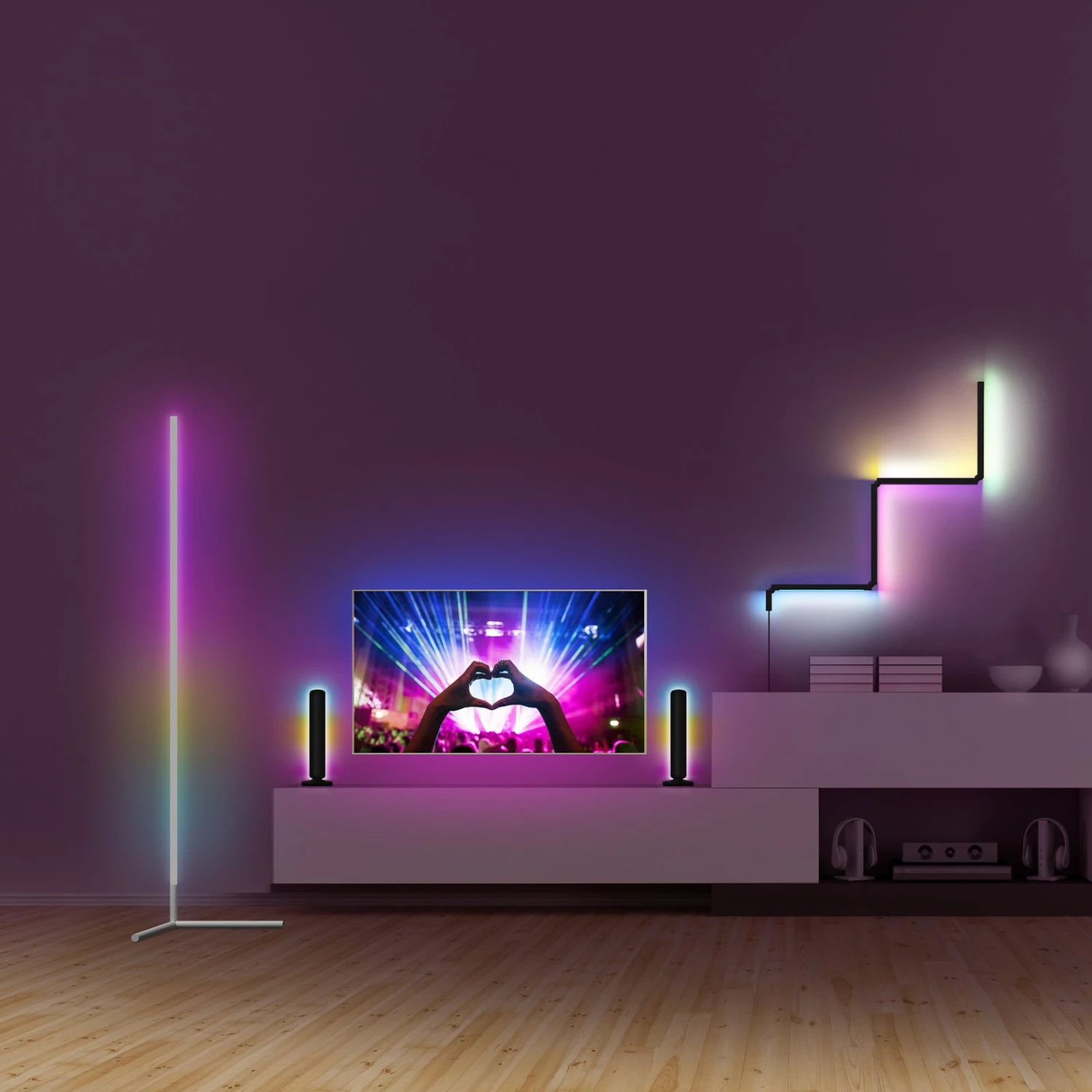 Lampada da terra LED Floor Corner – controllabile con telecomando o smartLa lampada da terra LED Floor Corner è dotata di una base ad angolo retto composta da due montanti, da cui sporge verso l’alto il sottile elemento luminoso. La luce dei LED installati nell’apparecchio sottile si irradia verso la parte posteriore, creando un’illuminazione indiretta. Brilla con luce bianca calda, bianca diurna o colorata e con qualsiasi luminosità. I singoli segmenti possono essere controllati indipendentemente l’uno dall’altro. Si controlla con il telecomando in dotazione o, dopo l’integrazione WLAN, tramite app o comando vocale.- Design chiaro e sottile, abbinabile a molti stili di arredamento- Installazione semplice e veloce- Funzionamento tramite il telecomando in dotazione o tramite l’app SMART WiFi, scaricabile gratuitamente per Android e iOS con funzione DIY: il colore della luce può essere regolato per segmento per creare scene di luce individuali o per utilizzare scene di luce già esistenti.- Funzione ritmo musicale: con l’aiuto dell’App SMART WiFi e dei ricevitori vocali integrati, l’apparecchio risponde a suoni e musica.