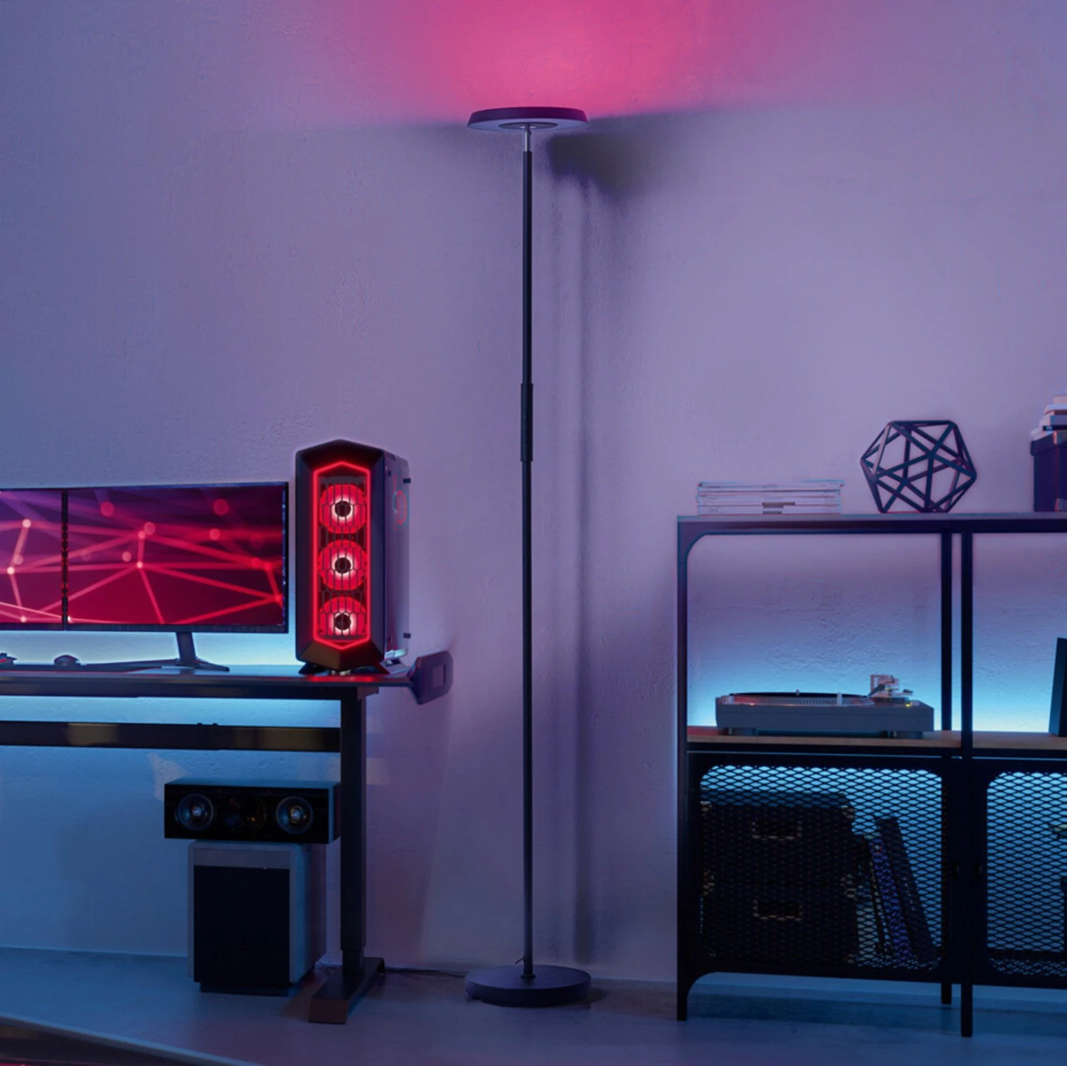 Lampada da terra LEDVANCE SMART LED dal design moderno con luce che brilla sopra e sottoQuesta lampada da terra a LED è ideale per un’illuminazione classica da lettura in salotto, ma anche per un’atmosfera suggestiva nelle applicazioni di intrattenimento domestico. Il paralume piatto e rotondo è dotato di LED da bianco caldo a bianco universale nella parte inferiore e di un’altra sorgente luminosa nella parte superiore, che fornisce un’illuminazione d’atmosfera colorata sul soffitto. Il colore della luce può essere commutato, dimmerato e controllato tramite la superficie di controllo direttamente sulla struttura della lampada da terra a LED o tramite WLAN utilizzando un’app o un comando vocale.Dati tecnici / compatibilità:- controllabile tramite l’app LEDVANCE SMART WiFi (disponibile gratuitamente per iOS e Android); consente preimpostazioni e automazioni- controllabile tramite la superficie di controllo sulla struttura della lampada- possibile il controllo vocale tramite Google Assistant o Amazon Alexa- RGB (uplight) e luce da bianco caldo a bianco universale (downlight)- dimmerabile- protocollo di rete: WiFi