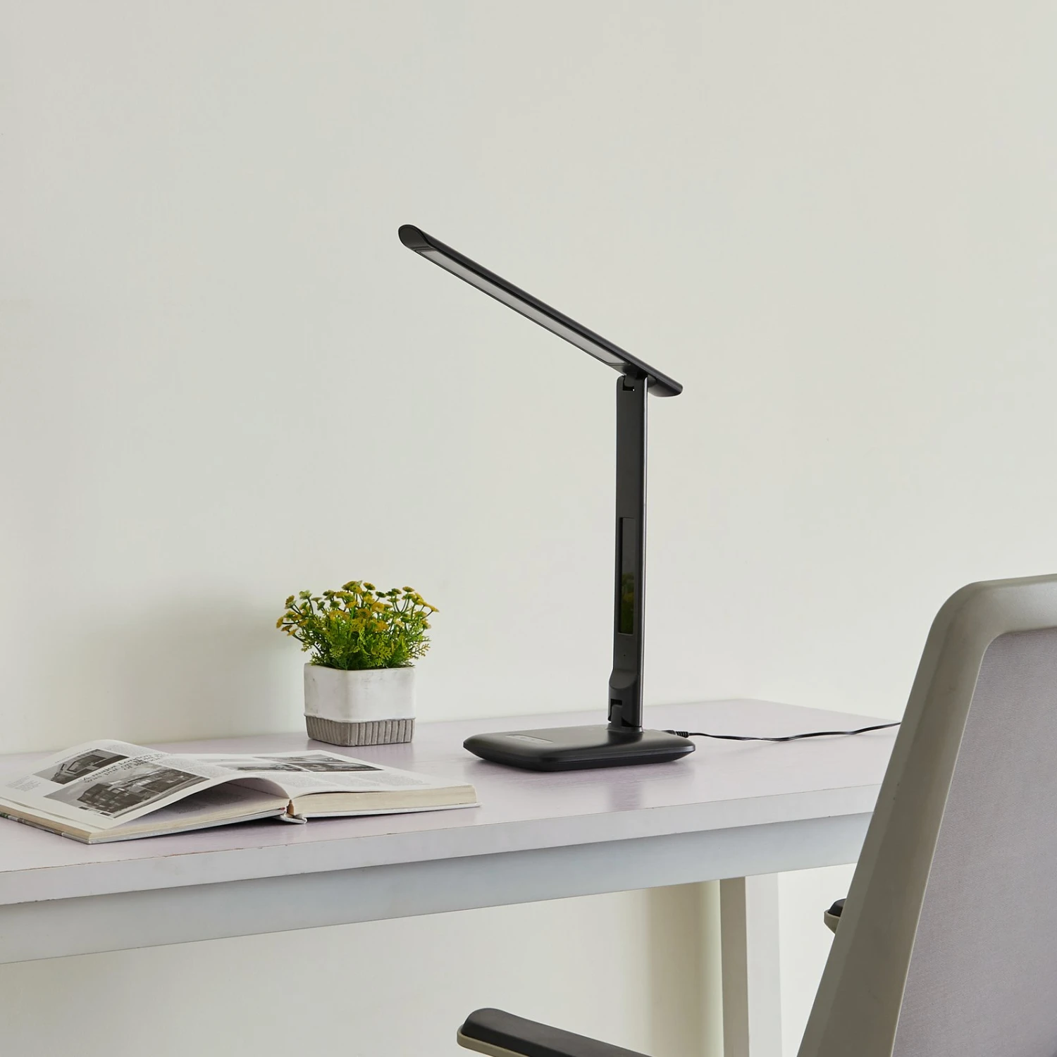 L’illuminazione luminosa della scrivania, regolabile nel colore della luce, è fornita dalla lampada da tavolo a LED Cerula. Può brillare di un colore bianco caldo o di un colore bianco universale, la selezione avviene tramite un interruttore a sfioramento sulla base. Il lungo braccio della lampada regolabile permette di orientare il fascio di luce in modo mirato.