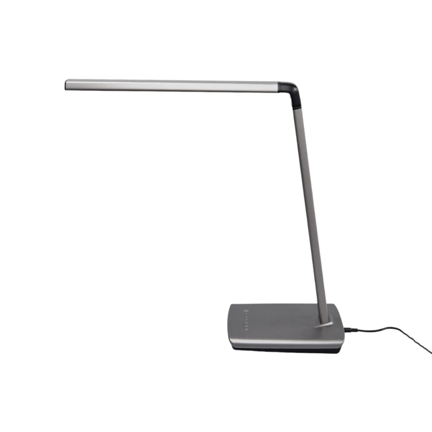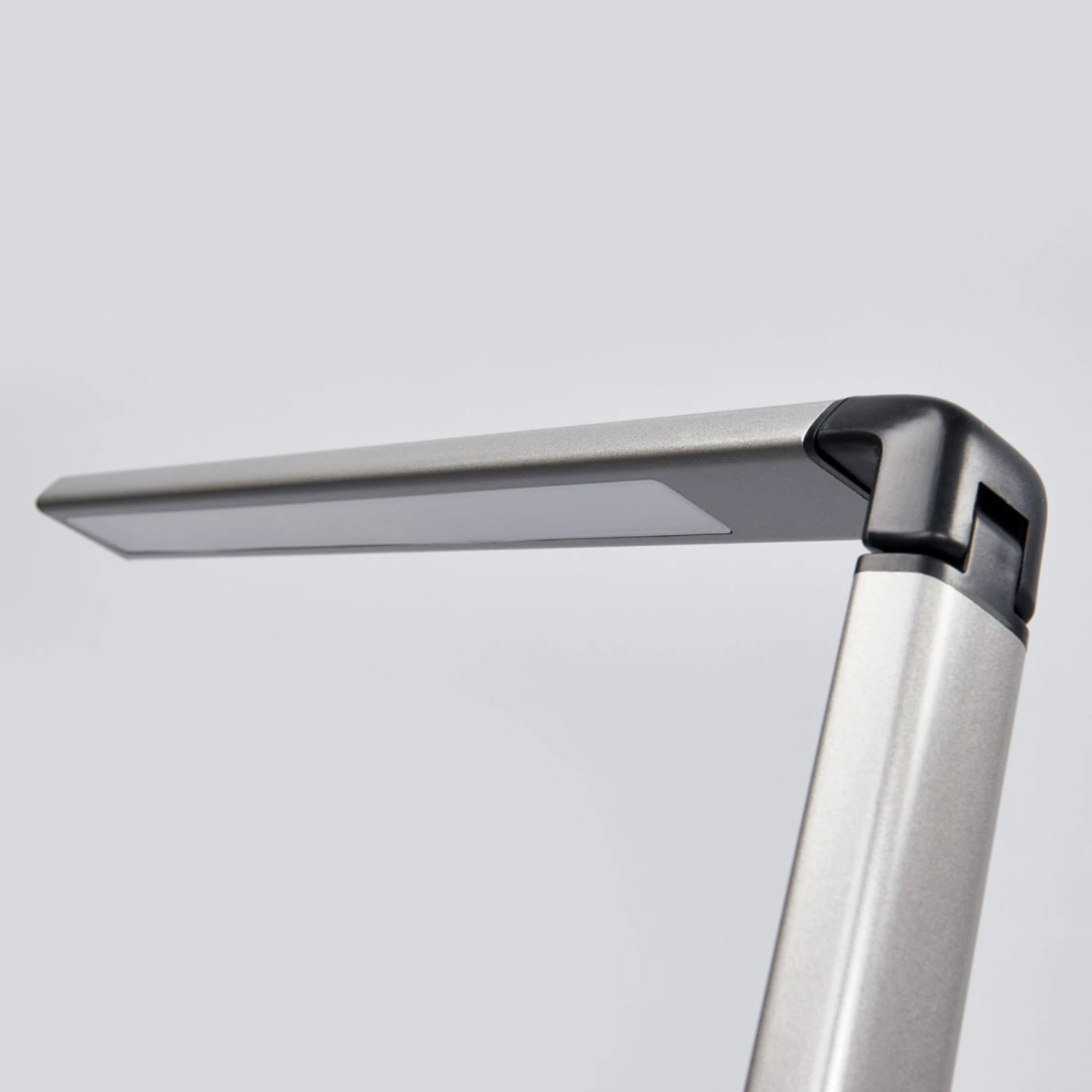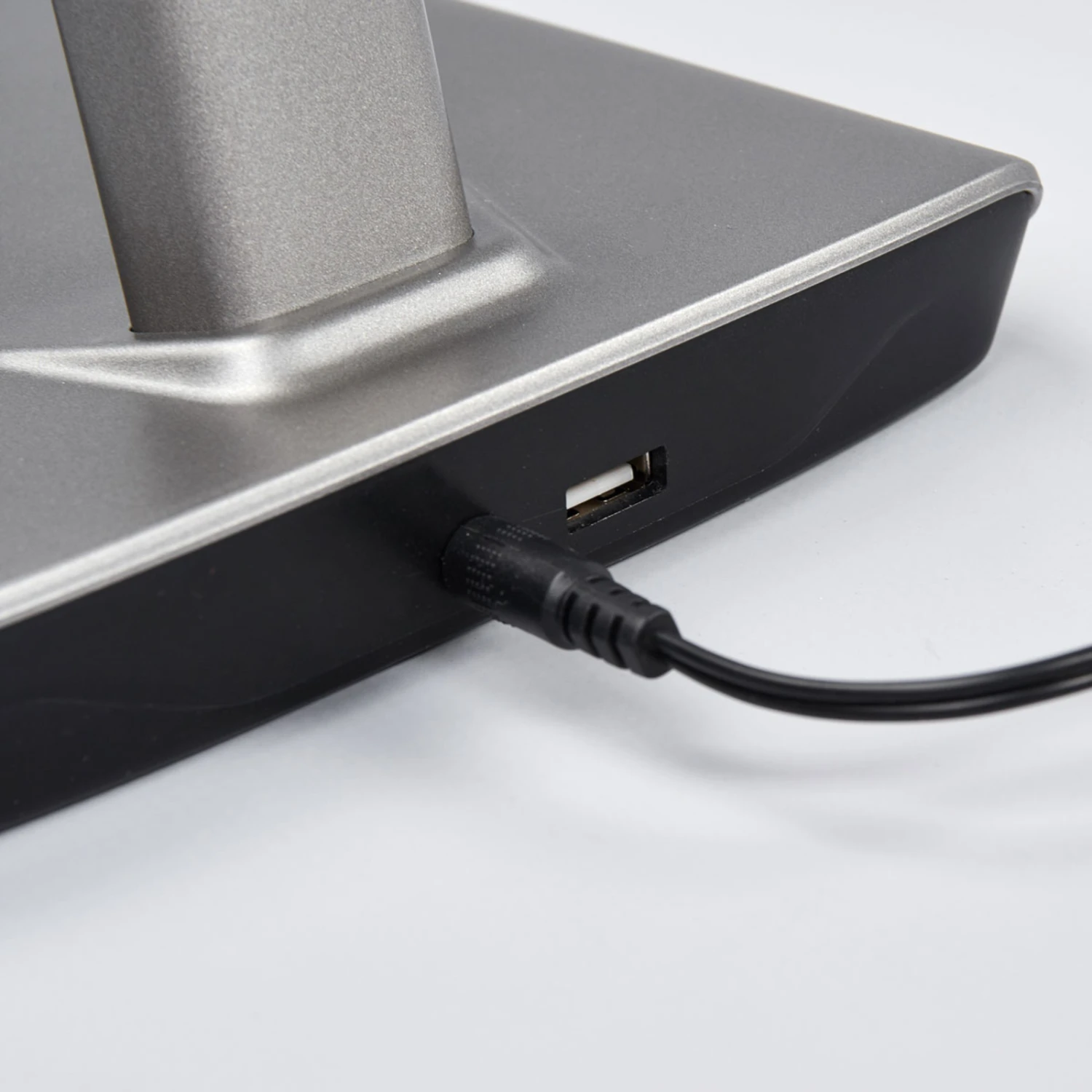 Lampada LED da tavolo Kuno con stazione di ricarica USB e dimmer a sfioramento La superficie di questa lampada LED da tavolo per la scrivania è di colore grigio metallizzato e sulla base della lampada è presente un interruttore a sfioramento, che può essere utilizzato anche per dimmerare la luce. La potenza luminosa di Kuno è particolarmente buona, ma la tecnologia LED consuma pochissimo, il che è molto piacevole per il consumatore. Una caratteristica particolarmente pratica della lampada LED da tavolo è la connessione USB, che permette di ricaricare il cellulare mentre ci si concentra sul lavoro.