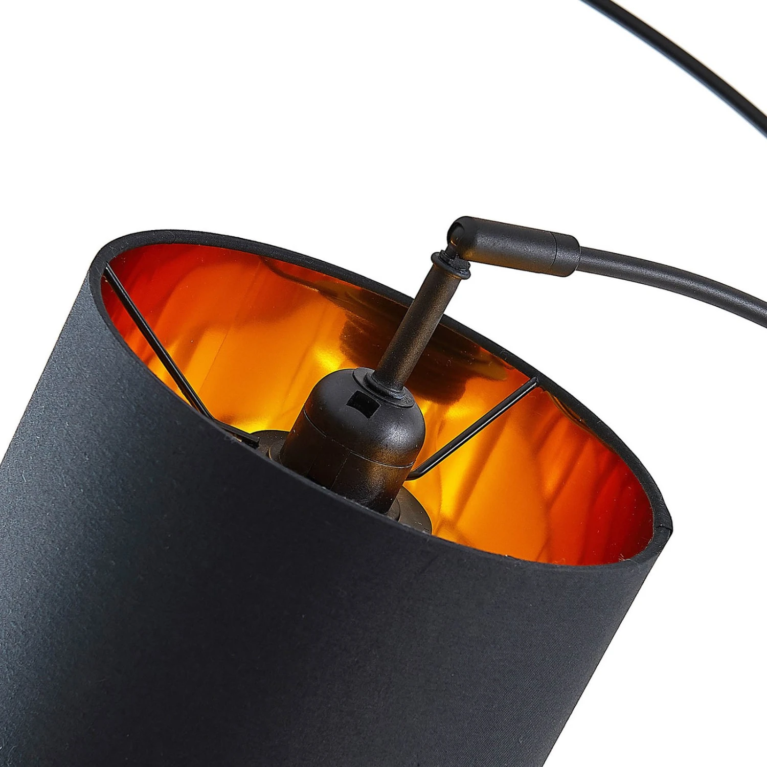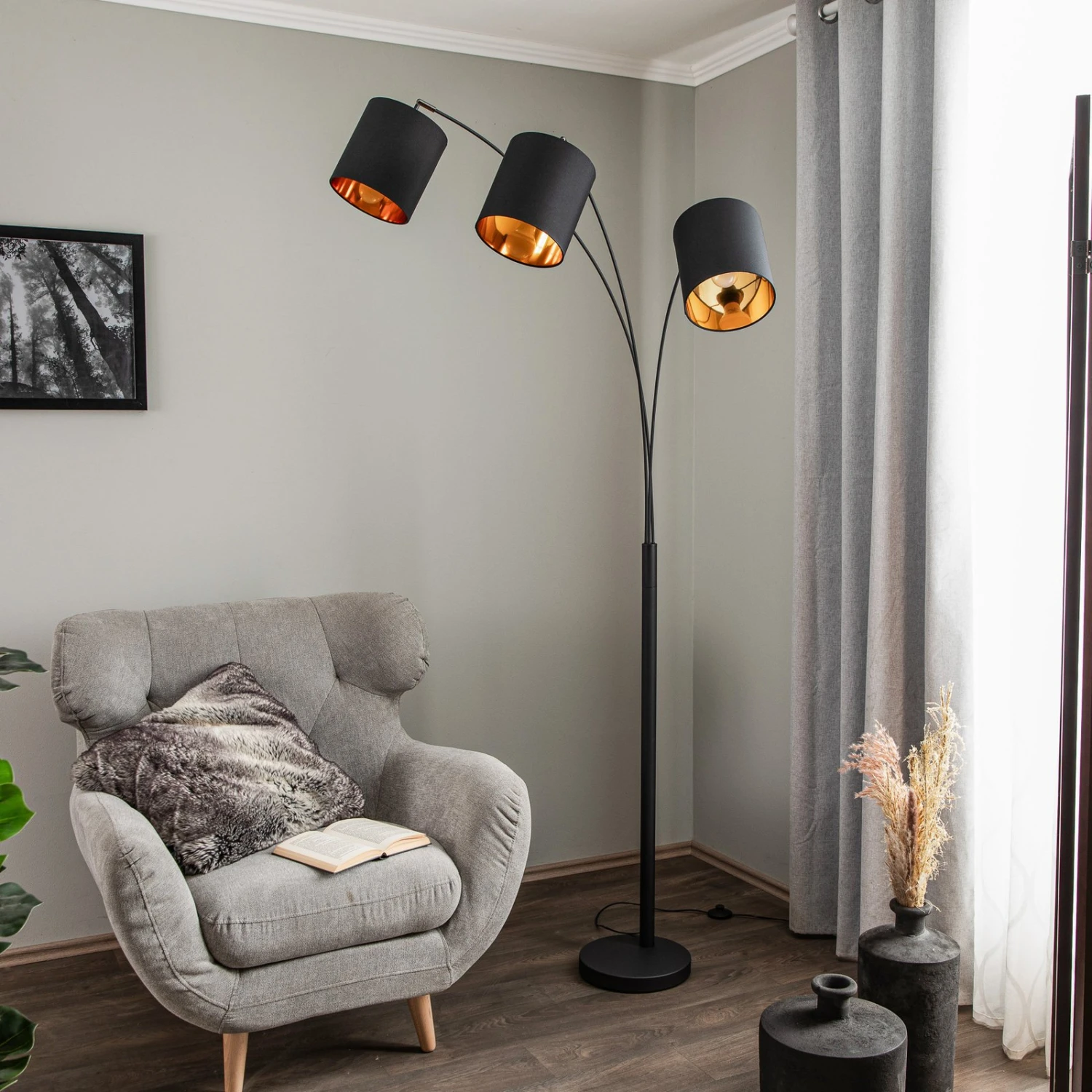 La lampada da terra Nanika è stata realizzata in acciaio e rivestita con una finitura superficiale nera. Ha una base rotonda che garantisce la necessaria stabilità e tre bracci curvi che caratterizzano il design. Anche i paralumi cilindrici in tessuto sono stati progettati in nero all’esterno e sorprendono con una calda tonalità dorata all’interno, che fornisce accenti di luce particolarmente caldi nella stanza. Questa lampada da terra si fa notare immediatamente grazie al suo aspetto scuro e si armonizza molto bene con gli stili di arredamento moderni – ideale come illuminazione aggiuntiva per il soggiorno.