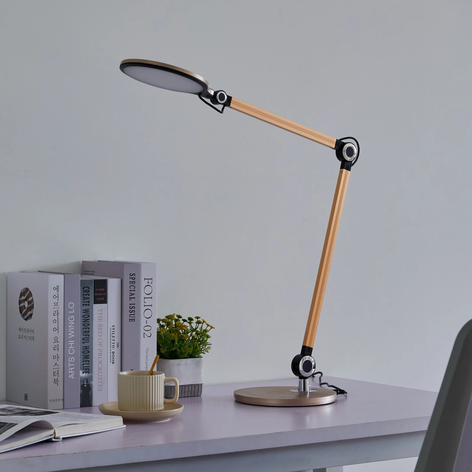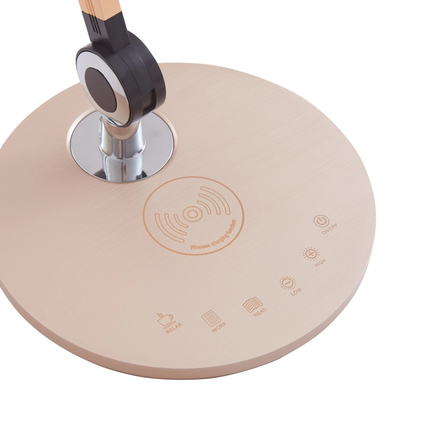 Nyxaris è una lampada da tavolo a LED in un’accattivante combinazione di colori dorati con stazione di ricarica wireless Nyxaris è ideale per illuminare la scrivania dell’ufficio. La lampada da tavolo a LED ha un’accattivante combinazione di colori dorati e un pratico braccio girevole. I suoi LED fissi possono essere dimmerati e il colore della luce può essere regolato su tre livelli (bianco caldo, bianco universale e luce diurna). In questo modo, l’apparecchio fornisce la giusta illuminazione in qualsiasi momento. Alla base si trova una stazione di ricarica wireless per smartphone o altri dispositivi.