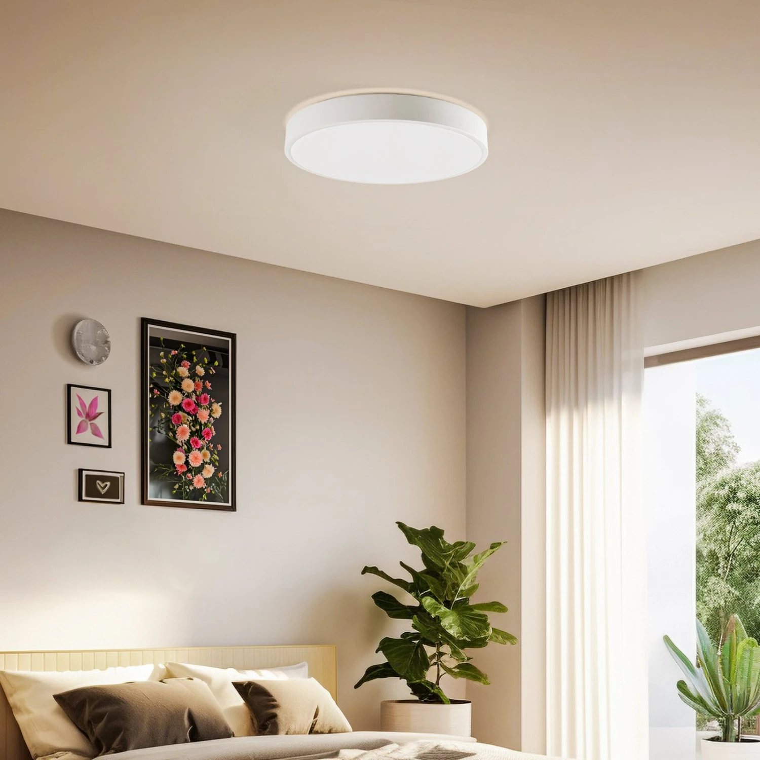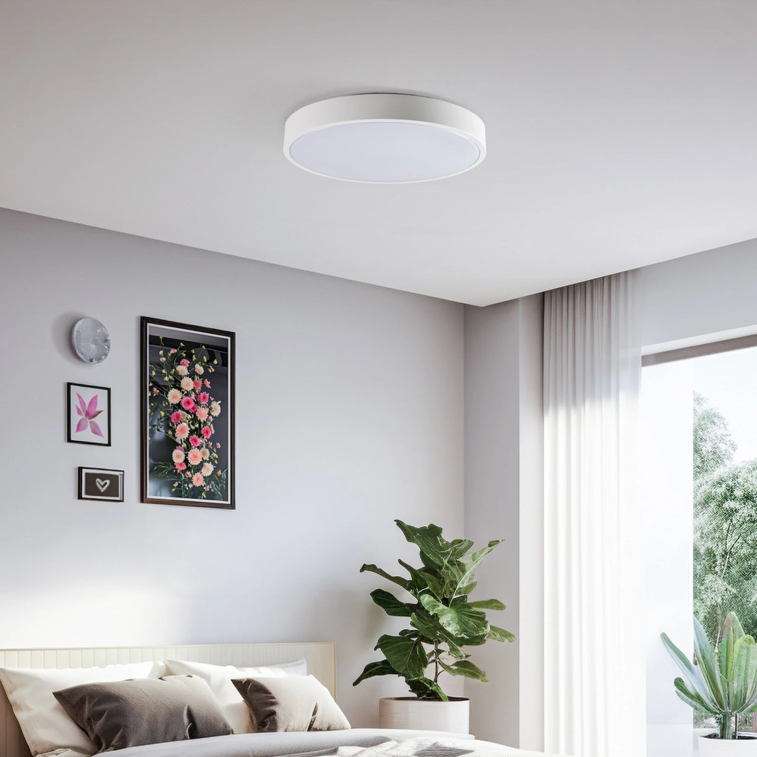 Perfetta per la casa intelligente – la plafoniera LED intelligente Innes La plafoniera LED Innes completa la dotazione della casa intelligente o è l’inizio di una casa intelligente. L’apparecchio rotondo è realizzato in plastica e metallo e presenta una colorazione bianca. I LED installati in modo permanente possono essere dimmerati e cambiare il colore di luce (3.000 – 6.500 K + multicolore), creando così sempre l’ambiente perfetto. La plafoniera Innes LED si controlla tramite l’app gratuita Tuya (disponibile per iOS e Android). Grazie al suo design semplice, può essere facilmente integrata in un’ampia varietà di stili di arredamento.