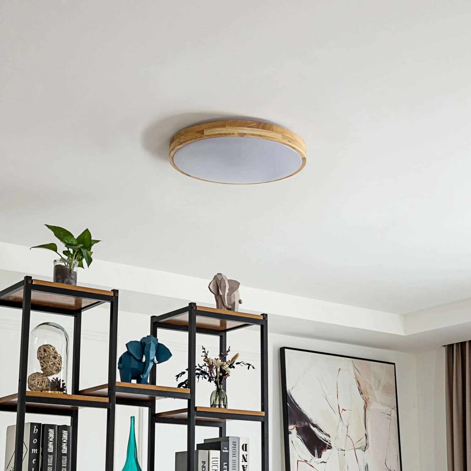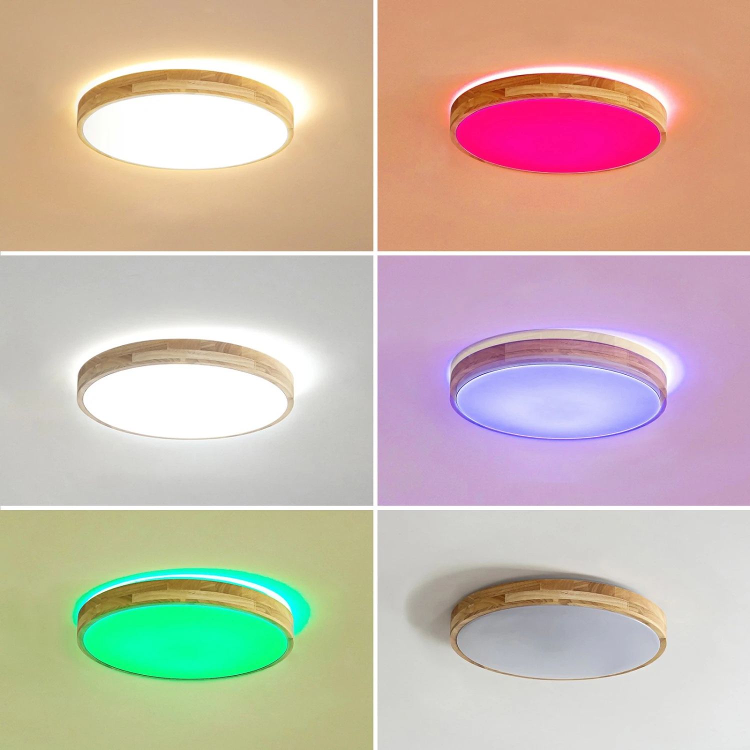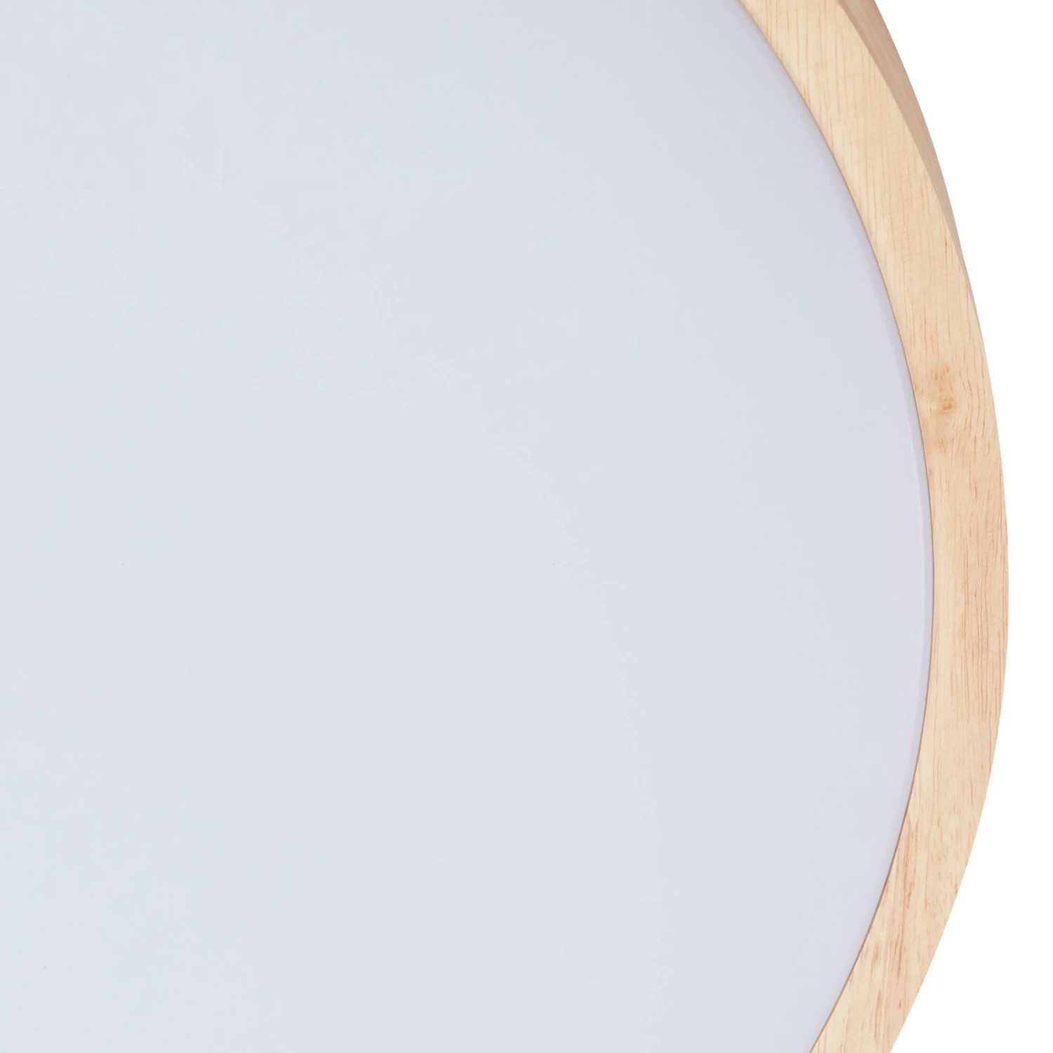 Plafoniera LED Innes in legno con funzione RGBW e dimmerabile Innes è rotonda e ha un design sorprendente. È realizzata in plastica e legno, il che crea un contrasto sorprendente. È dotata di LED installati in modo permanente che possono essere dimmerati in modo continuo e cambiare il colore di luce (3.000 K – 6.500 K + multicolore). Il tutto viene controllato tramite l’applicazione gratuita Tuya (disponibile per iOS e Android), che rende particolarmente facile la personalizzazione dell’illuminazione. Innes è ideale per illuminare un soggiorno o un corridoio.