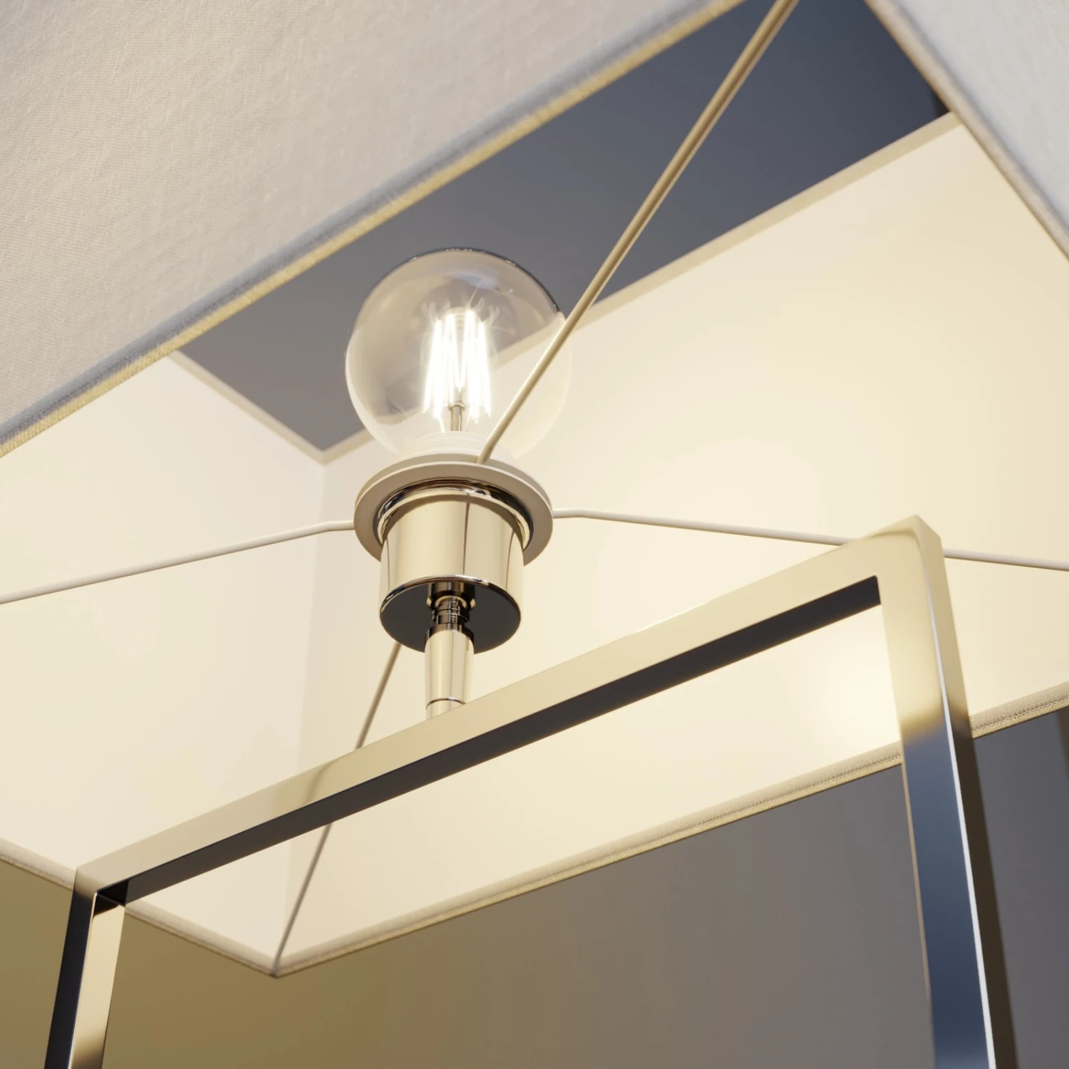 La struttura portante della lampada da terra Evaine è uno stelo cromato di bella linea ricurva. Si completa con un paralume bianco di moderna forma squadrata. Il paralume diffonde un’illuminazione piacevole e d’atmosfera. La lampada può trovare posto ad esempio in salotto o in camera da letto, crea una luminosità soffusa e costituisce una presenza di stile. Per accendere la luce si usa un comodo interruttore a pedale inserito nel cavo.