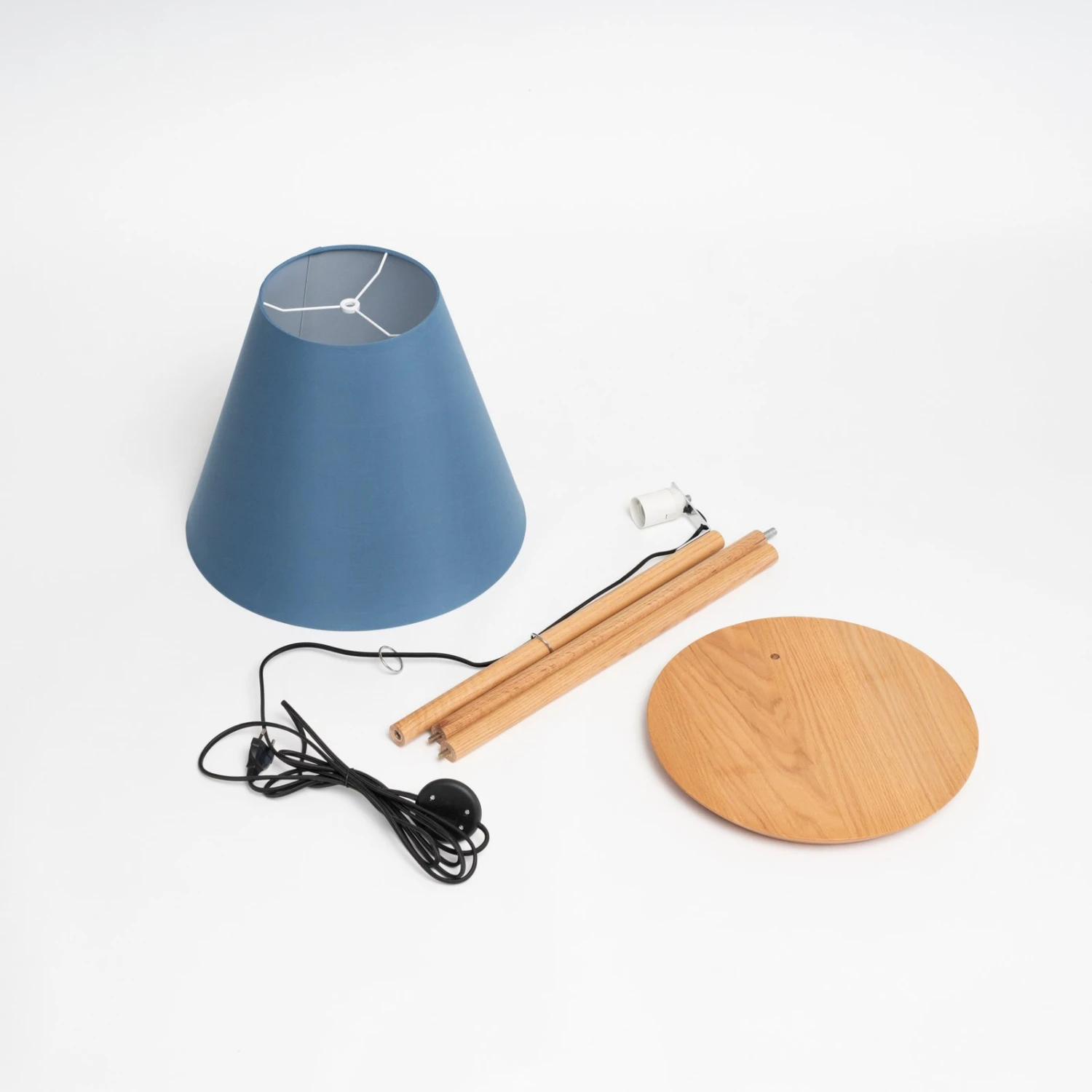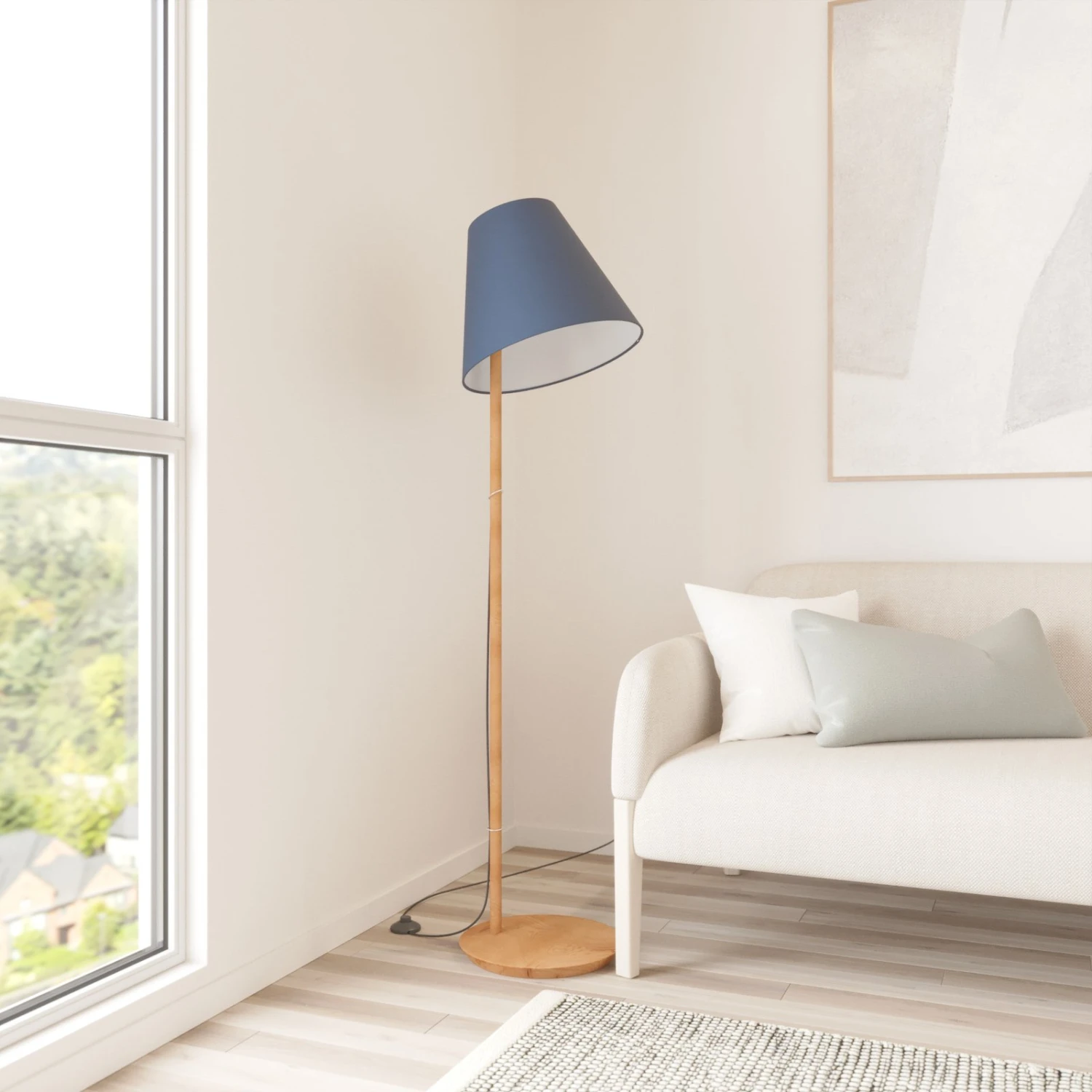 Una nobile nuova interpretazione dell’accoglienza scandinava: la lampada da terra in tessuto blu Jinda con struttura in legno