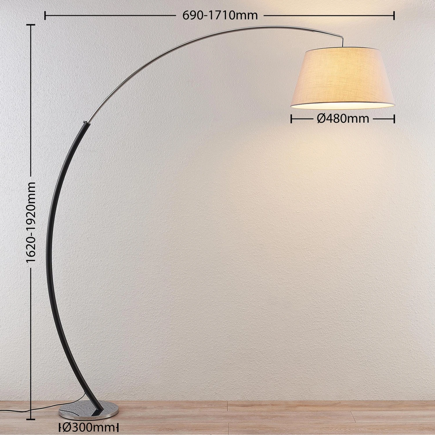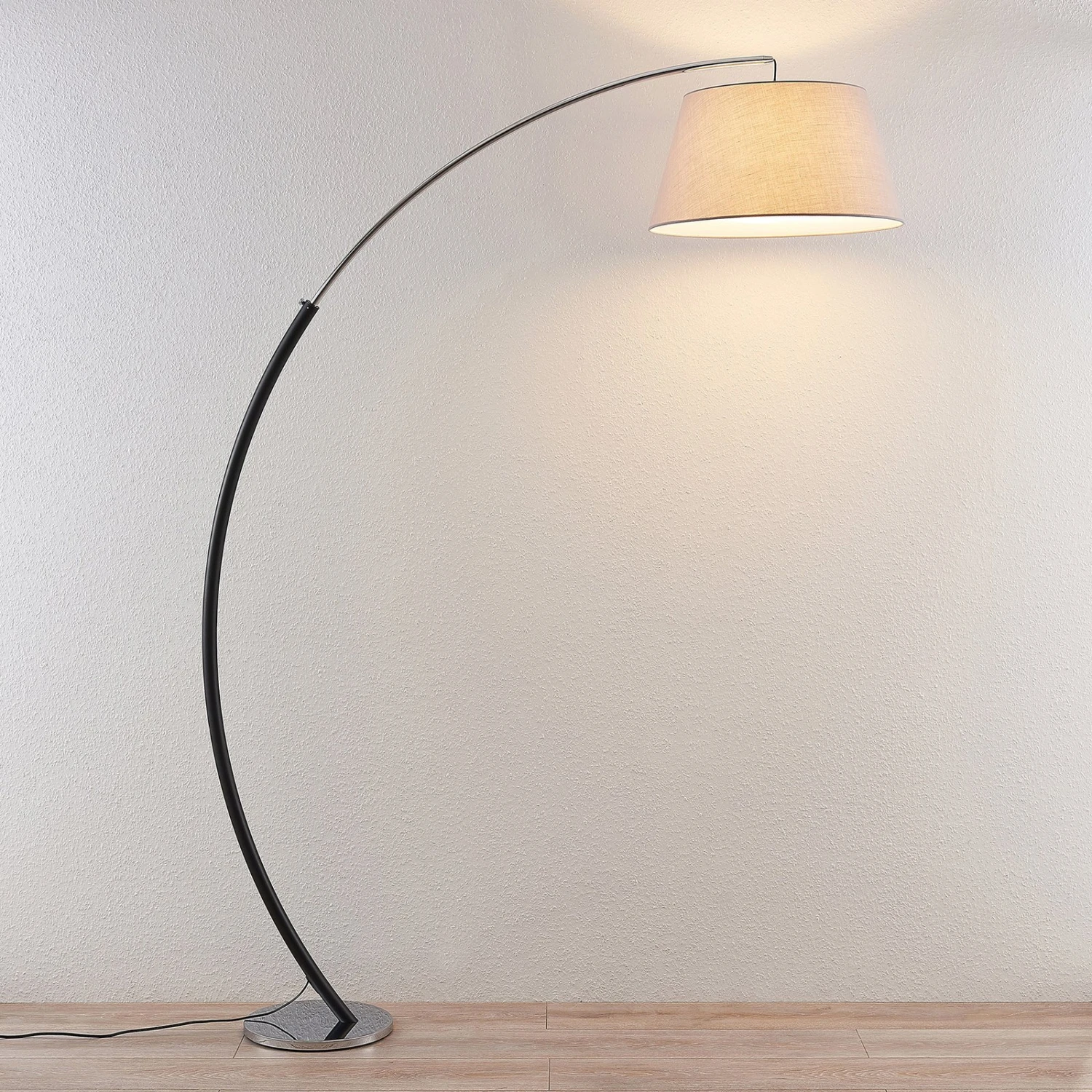 Lampada a arco Evelyna con paralume di stoffa grigia