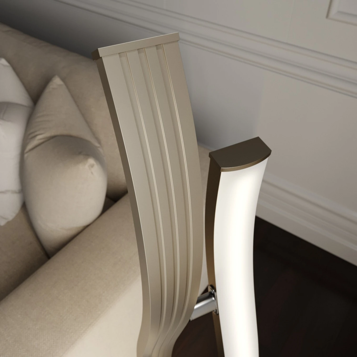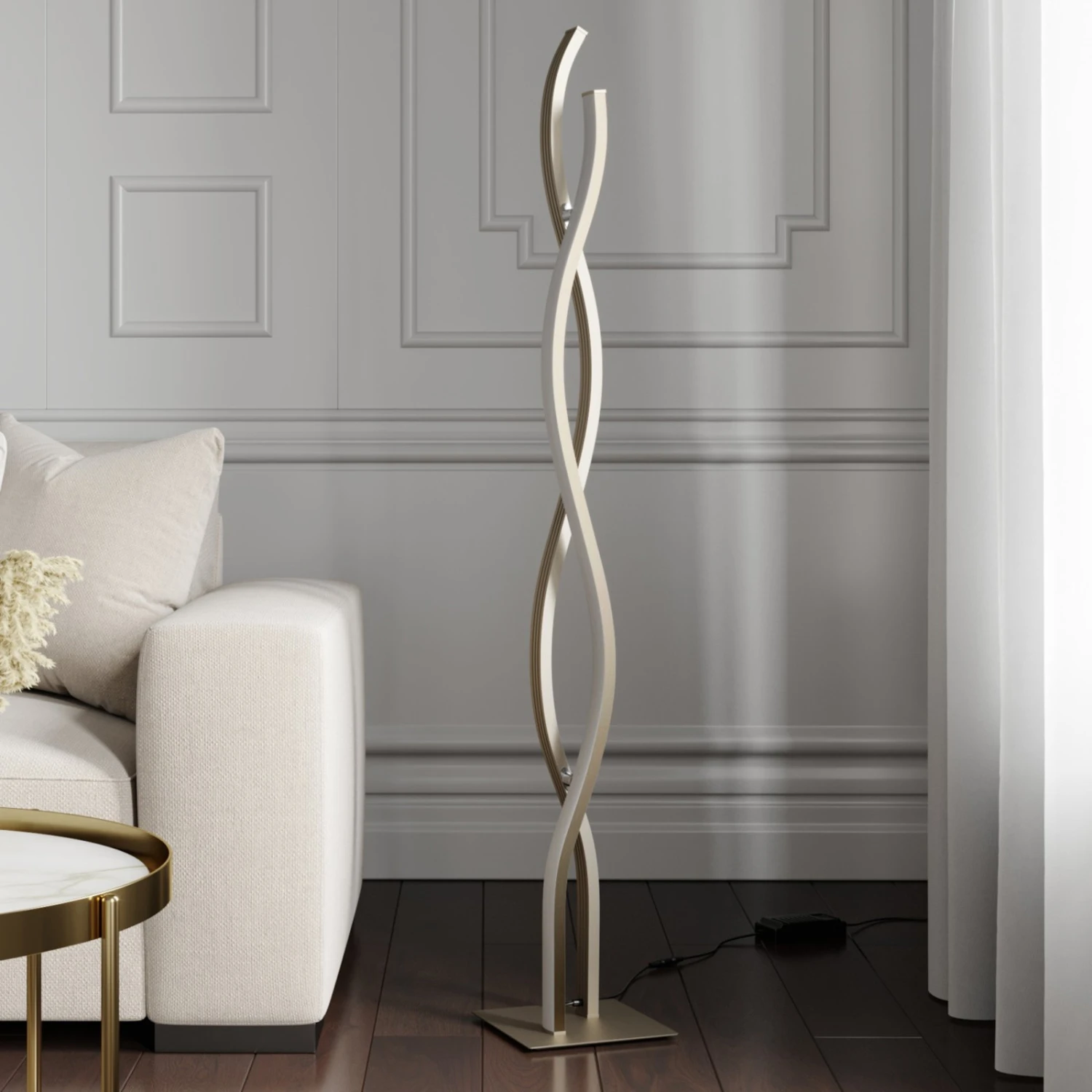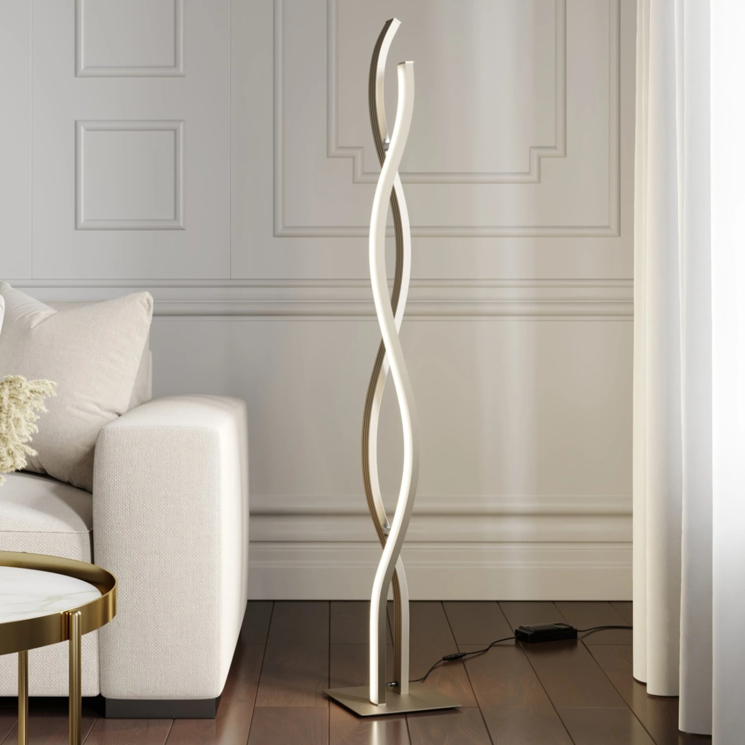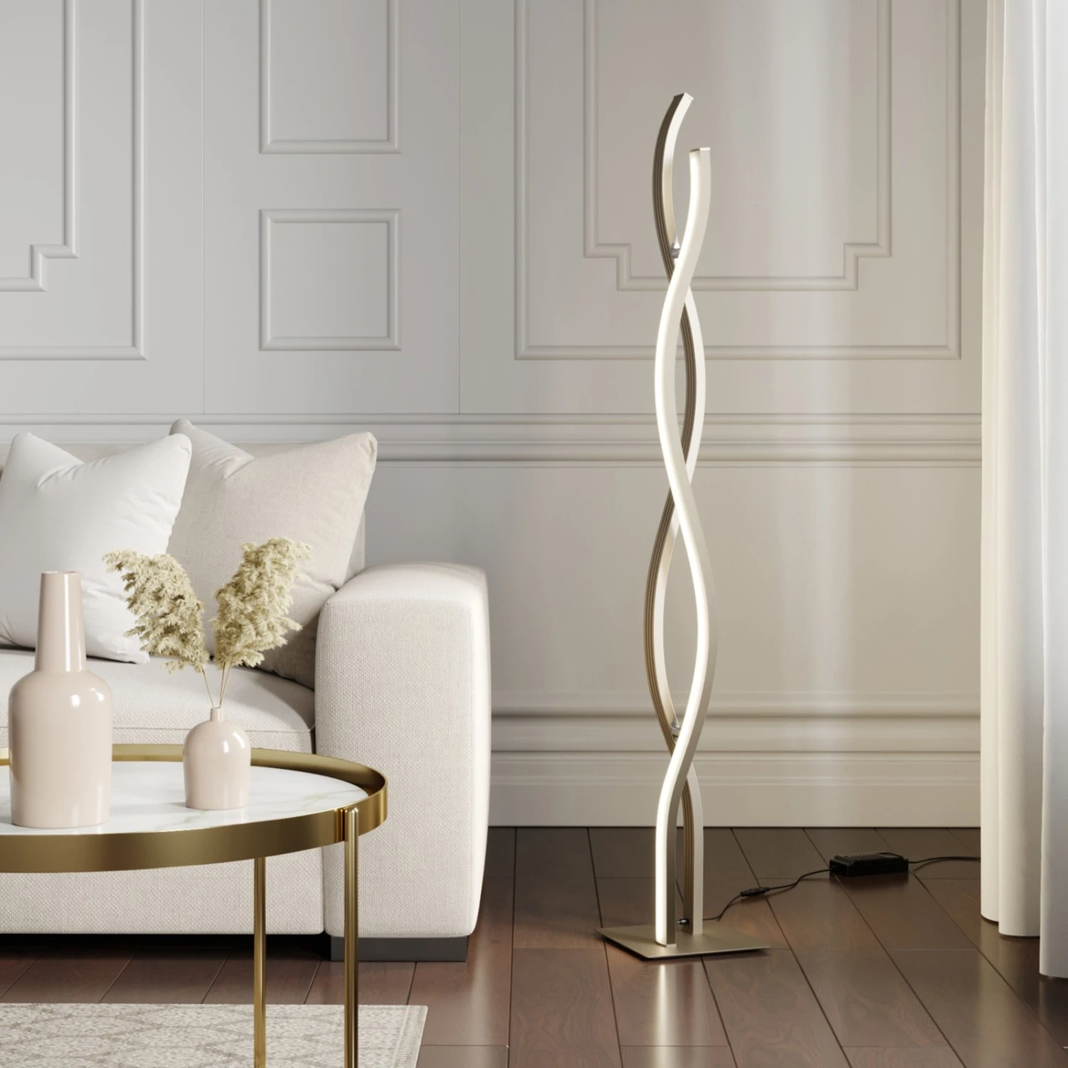 La lampada da terra LED Mairia costituisce una presenza di raffinato purismo. Le due onde si integrano perfettamente l’una con l’altra componendo un insieme armonioso grazie alle linee arrotondate. Gli elementi sono dotati di efficienti LED che diffondono la luce con omogeneità. I LED emettono luce bianca di tonalità calda. La luminosità si può regolare a tre livelli variando l’atmosfera. Mairia pertanto è una lampada perfetta per un’illuminazione accogliente in soggiorno. Fa bella figura soprattutto in una casa moderna ed è sempre un bel colpo d’occhio.