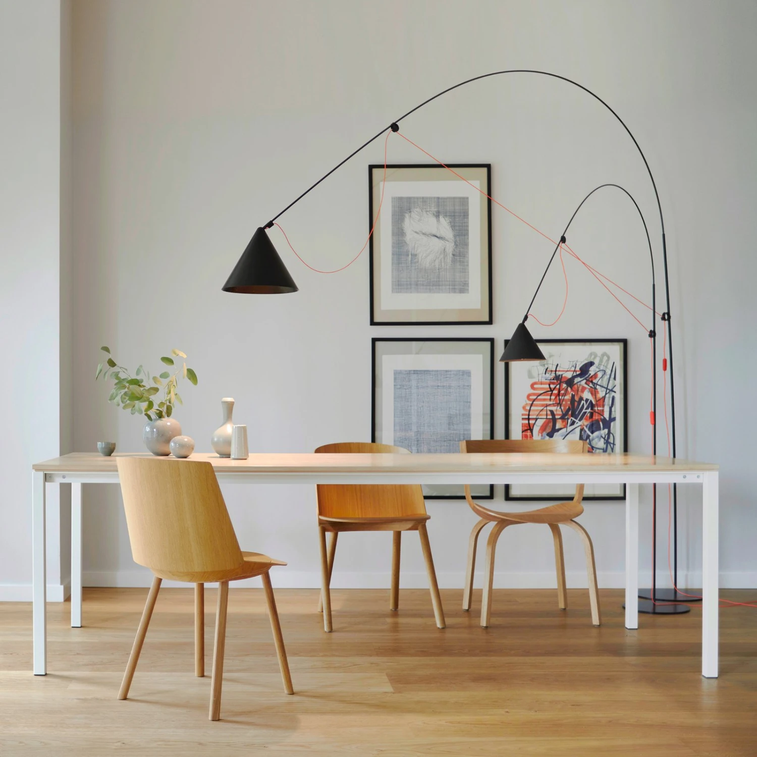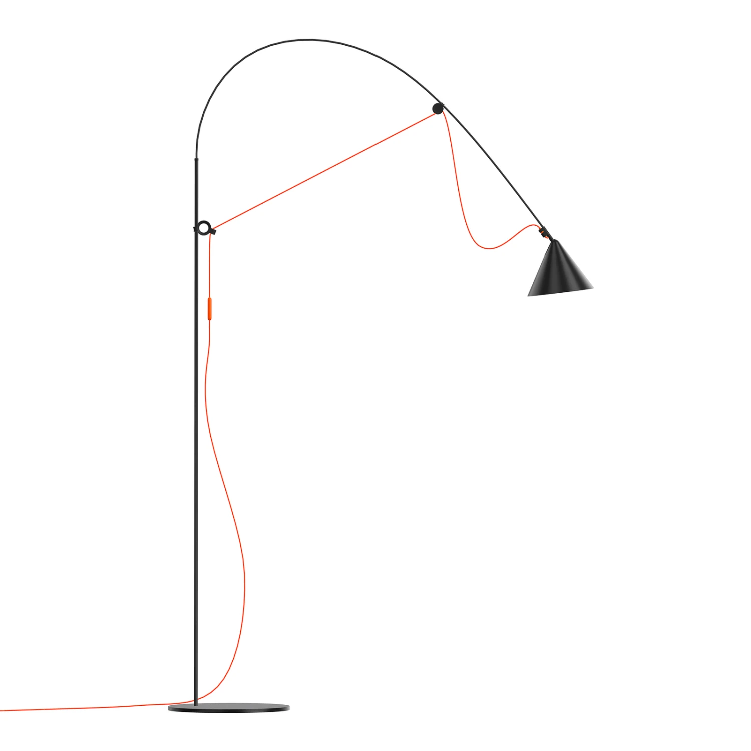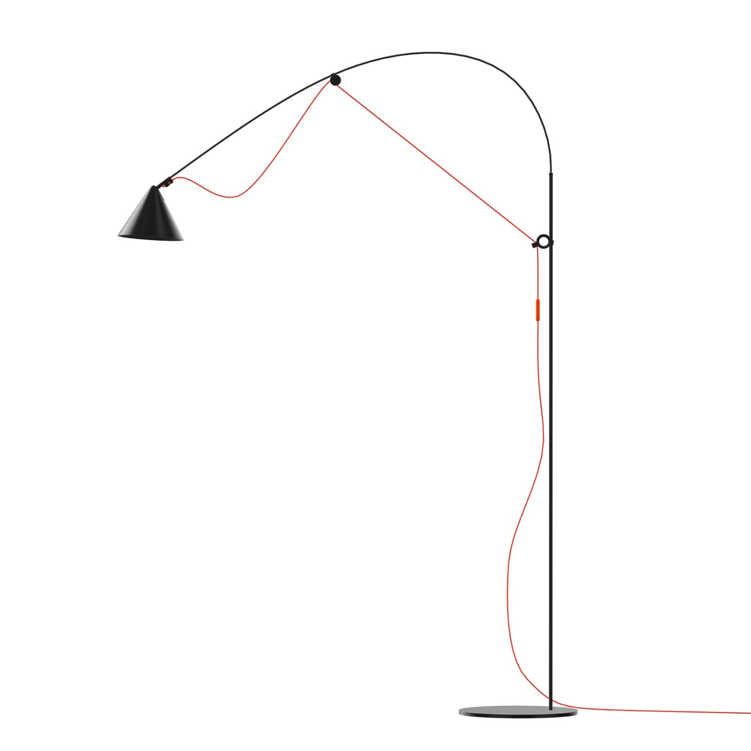 AYNO, lampada da terra a LED con dimmerIl produttore di apparecchi di illuminazione Midgard è stato fondato dall’ingegnere Curt Fischer (1890 – 1956), considerato l’inventore della luce direzionabile. La serie AYNO è una nuova interpretazione di questa idea da parte del designer industriale Stefan Diez. La lampada da terra AYNO è una fonte di luce creativa, intelligente e versatile per soggiorni e salotti, ma anche per locali commerciali e uffici di prestigio. Sopra la base rotonda in acciaio, si erge un’asta verticale dalla quale emerge un braccio in fibra di vetro. Quest’ultimo è inizialmente verticale a causa della sua tensione intrinseca. Il cavo tessile, che corre esternamente, è fissato con due anelli regolabili che, a seconda della distanza, tirano il cavo e quindi inclinano il braccio verso il basso. In questo modo AYNO si trasforma in un attimo in una lampada ad arco. Ulteriori possibilità di regolazione sono offerte dall’interruttore dimmer sul cavo a innesto e dall’attacco girevole del paralume a forma di cono. Quest’ultimo è realizzato in plastica riciclata policarbonato/ABS e ospita un modulo LED di alta qualità (CRI ≥ 95) che può essere facilmente rimosso in caso di difetto (aggancio a baionetta). La copertura strutturata garantisce una diffusione omogenea e un abbagliamento ridotto (UGR ≤ 16) della luce.- Vincitore del Premio tedesco per la sostenibilità Design 2020