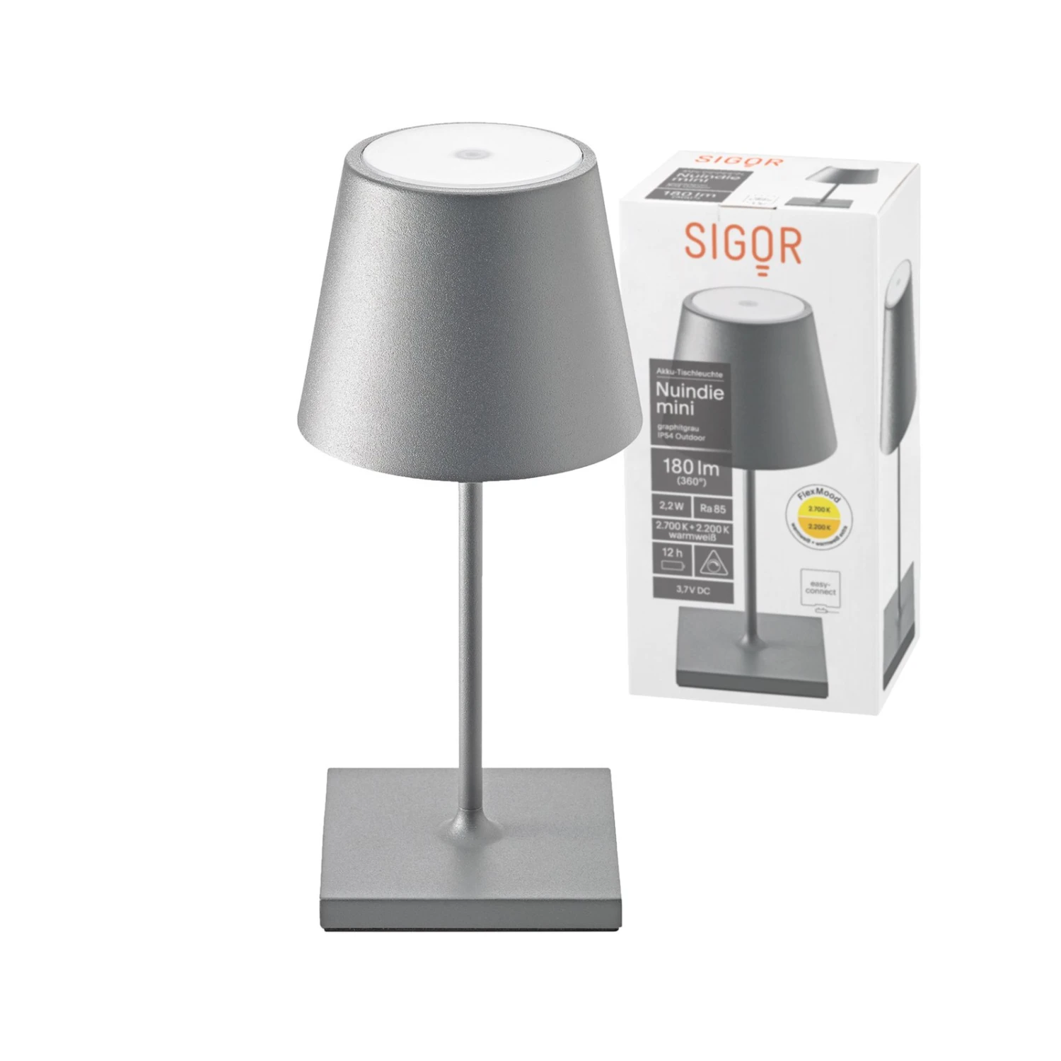 Nuindie mini – pratica lampada da tavolo LED ricaricabile con paralume rotondo, dimmerabile, IP54 La serie Nuindie di Sigor è la lampada compatta da tavolo LED ricaricabile che si integra facilmente in diversi ambienti grazie alla sua forma naturale e senza tempo. Per il campeggio, come luce da patio, per l’illuminazione di un ristorante o come illuminazione aggiuntiva in soggiorno, sala da pranzo o camera da letto: ovunque offre una luce mobile e semplice. Il caratteristico paralume della piccola lampada da tavolo, dall’intramontabile forma tronco-conica, fornisce un’illuminazione non abbagliante e una piacevole luce d’accento verso l’alto e verso il basso per tavoli, credenze, scaffali o davanzali. Nuindie mini combina un design senza tempo con un’illuminazione LED all’avanguardia e senza fili. La lampada da tavolo dimmerabile e ricaricabile per interni ed esterni resiste anche agli acquazzoni grazie al grado di protezione IP54. La lampada da tavolo ricaricabile può essere ricaricata in ambienti interni asciutti utilizzando l’alimentatore USB plug-in in dotazione e il cavo di ricarica lungo 1,2 m con spina USB-C standard. Il funzionamento avviene tramite l’interruttore a sfioramento sul paralume. Alla prima accensione, Nuindie mini emette una luce bianca calda a 2.700 K e, con un secondo tocco, può passare alla modalità 2.200 K per creare un’atmosfera ancora più accogliente. L’emissione luminosa può essere dimmerata tenendo premuto l’interruttore più a lungo – Tempo di ricarica da 5 a 7 ore – Tempo di illuminazione per carica fino a 12 ore al 100 % di potenza