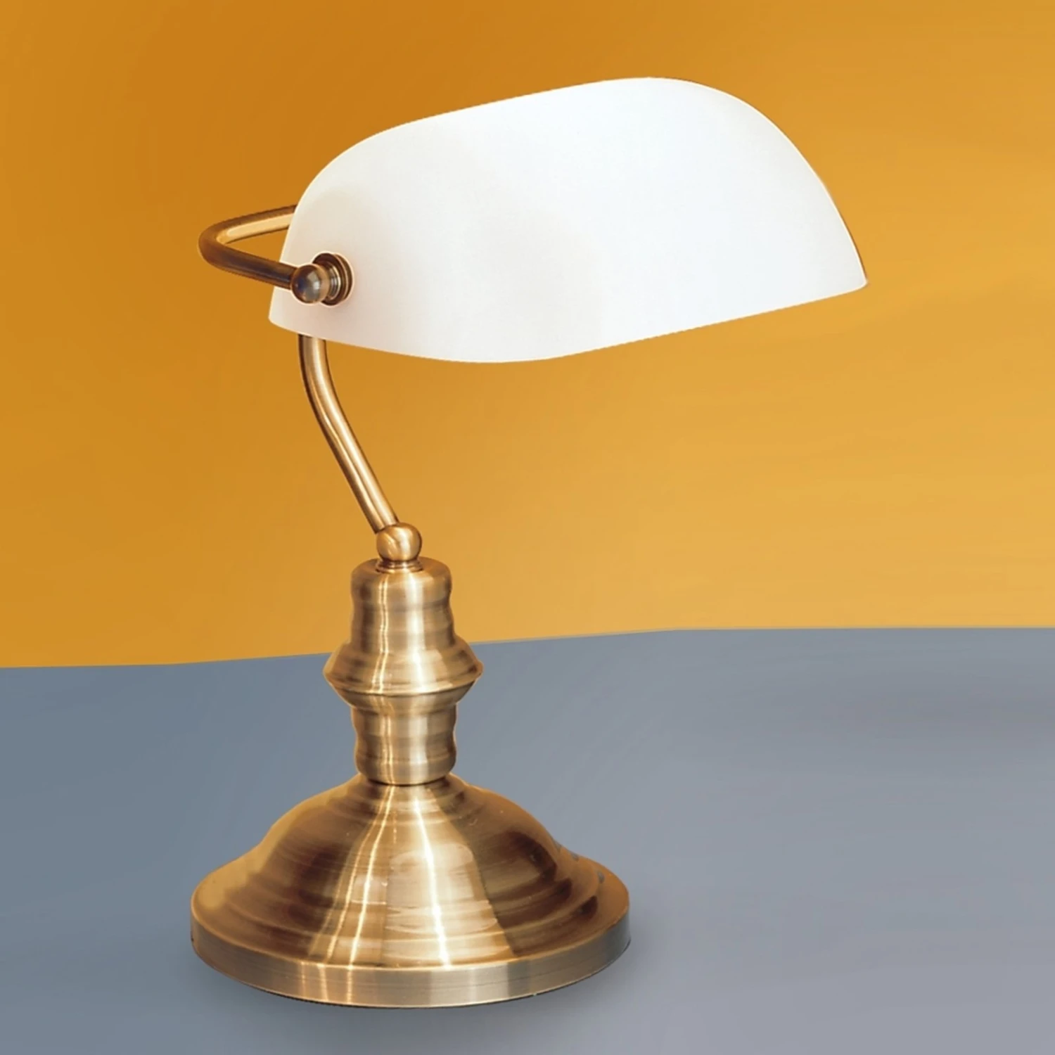 Lampada da banco Onella con struttura in ottone anticatoLa lampada da tavolo Onella si presenta nello stile di una lampada da banco, particolarmente adatta alla scrivania. Il paralume bianco e allungato può essere orientato in modo da regolare l’incidenza della luce a un certo livello.