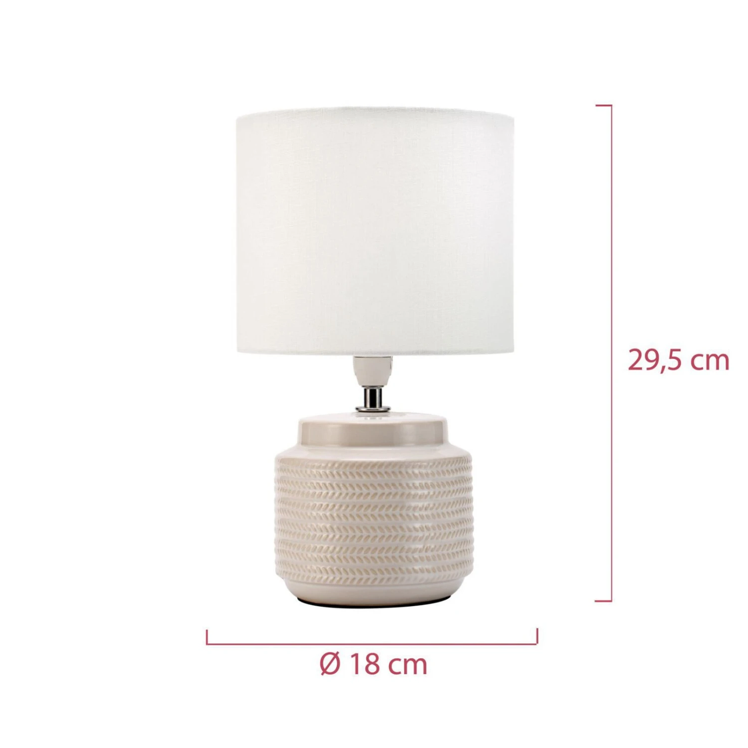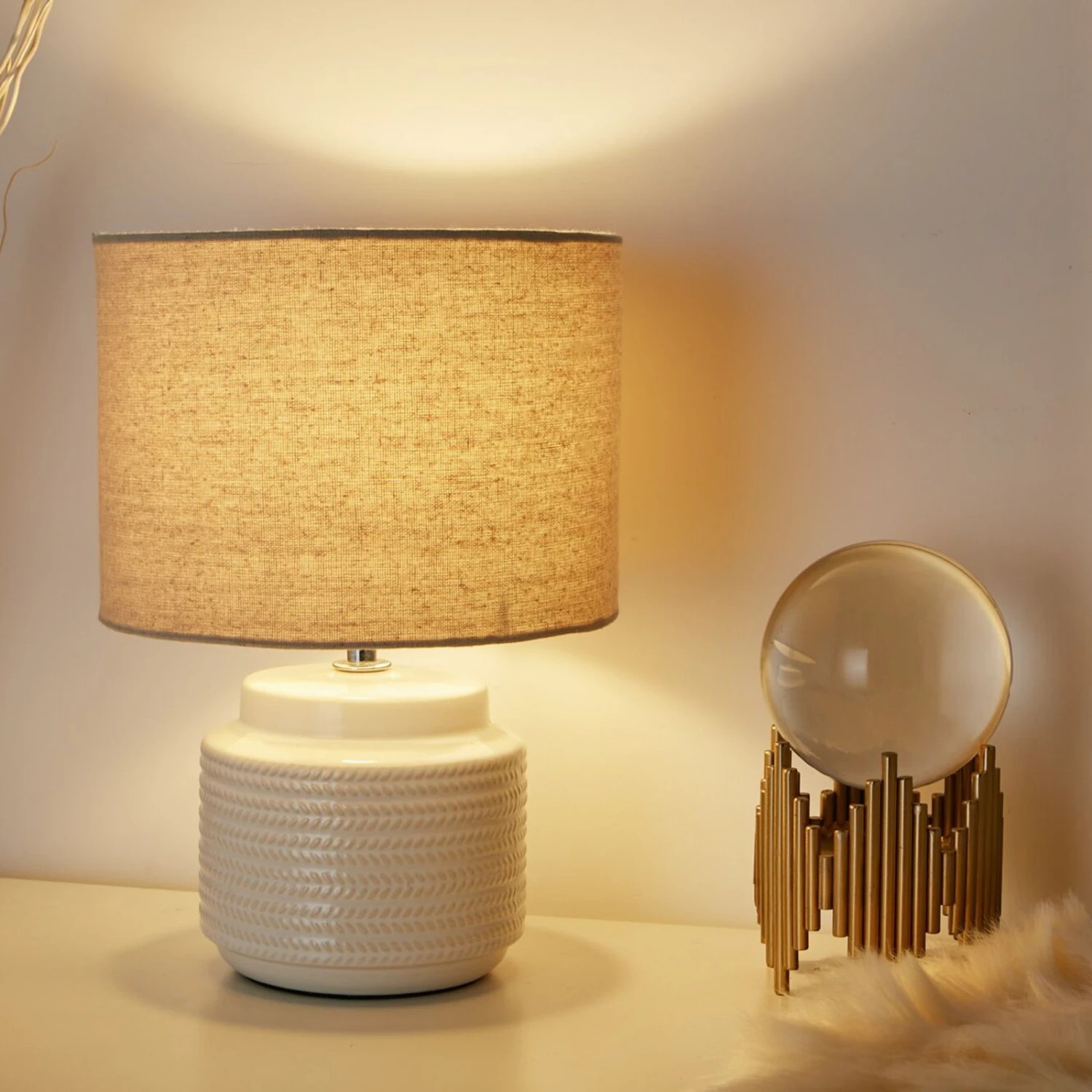 Con la sua base in ceramica luminosa con un bel motivo in rilievo tutto intorno e un paralume cilindrico bianco in tessuto, la lampada da tavolo Bright Soul è una luce che si adatta perfettamente al comodino. La lampada da tavolo è una vera e propria decorazione tuttofare che si inserisce discretamente in qualsiasi stanza e crea un bel risalto luminoso su un tavolo o un comò.