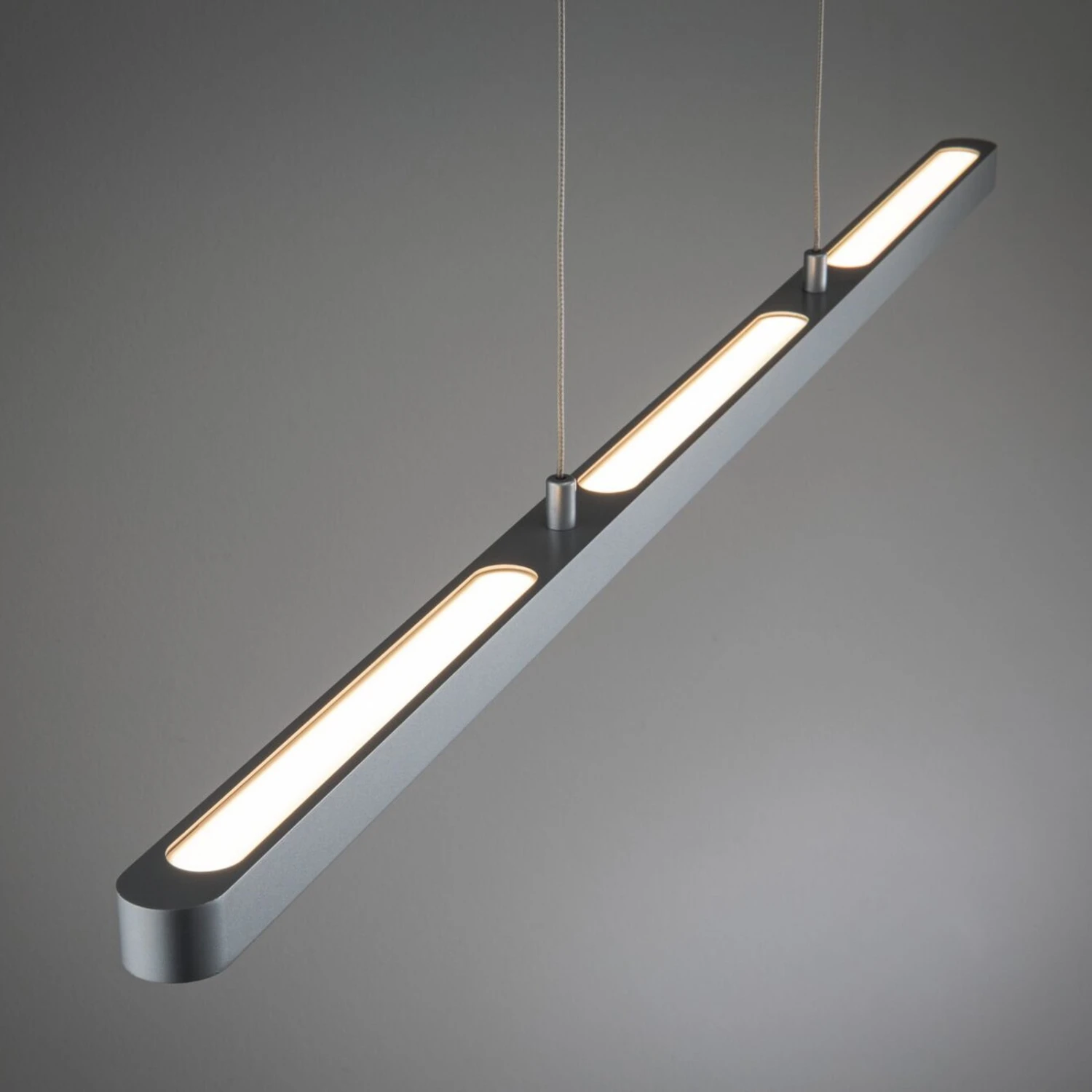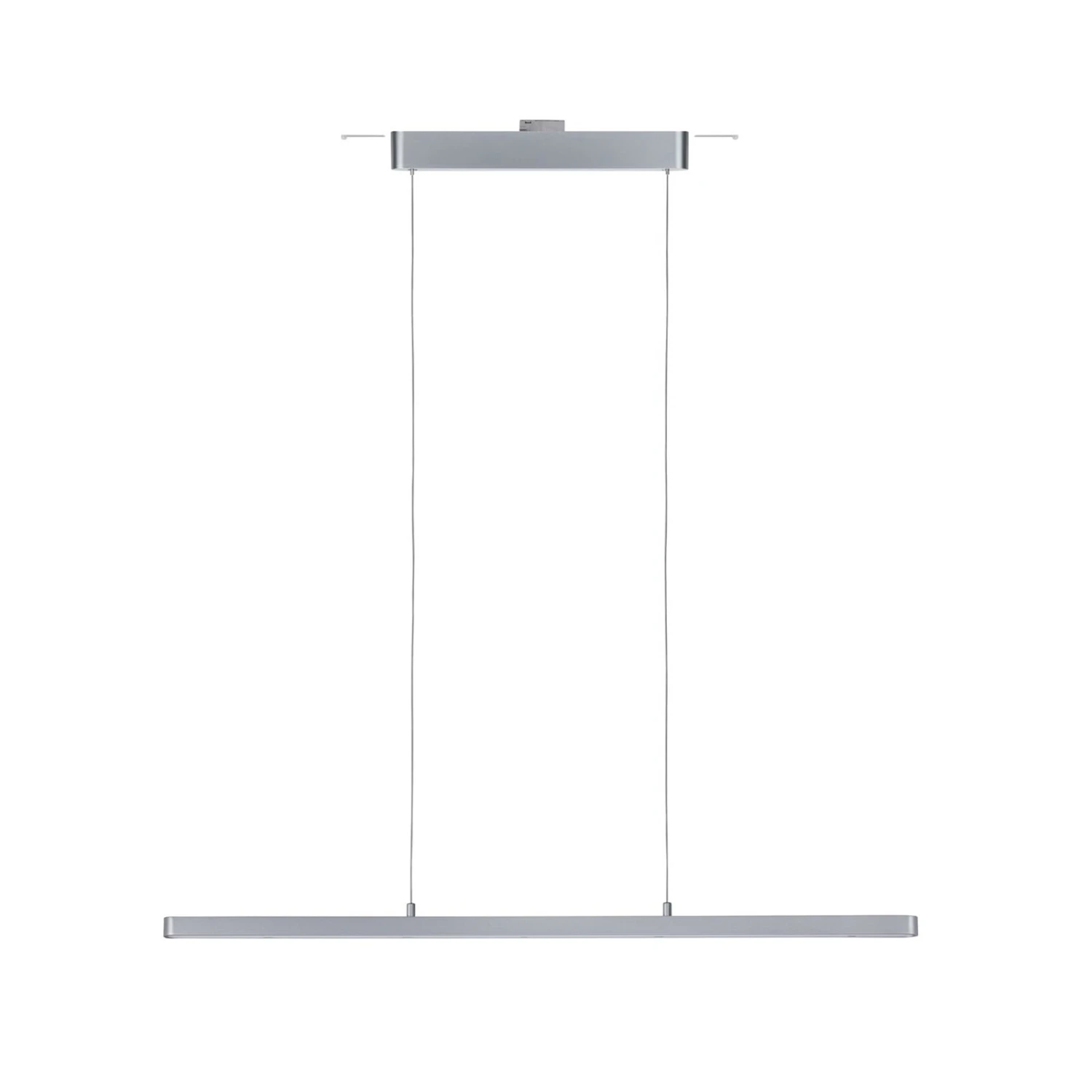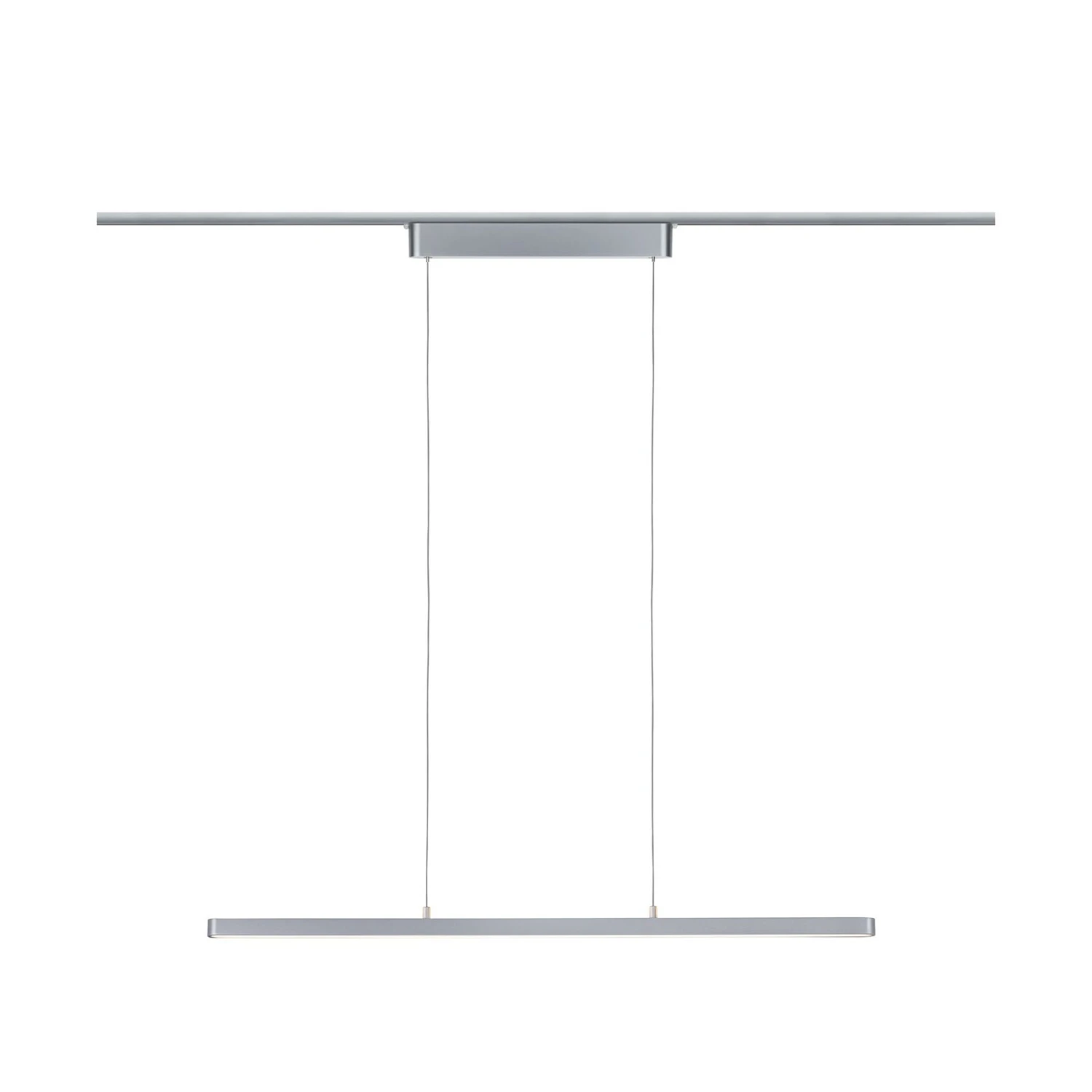 L’apparecchio a sospensione Lento LED in metallo per il sistema di binari Paulmann URail emette la sua luce sia direttamente verso il basso che indirettamente verso l’alto. In questo modo si ottiene una buona illuminazione a tutto tondo. È collegato al tettuccio, anch’esso in metallo, tramite due cavi.