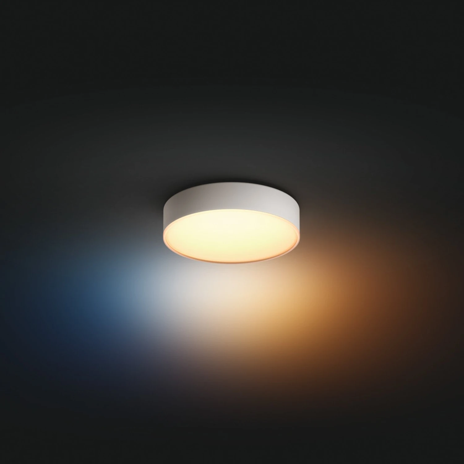 La plafoniera rotonda a LED Hue Enrave offre una luce brillante e ad ampio raggio. Che sia in soggiorno, in corridoio o nella zona notte, Enrave offre una luminosità regolabile e tonalità di bianco nello spettro dal bianco caldo alla luce del giorno, la luce giusta in qualsiasi momento della giornata. Grazie all’interruttore dimmer incluso, la plafoniera può essere direttamente accesa e spenta, oltre che dimmerata. In alternativa, l’apparecchio può anche essere controllato via Bluetooth con il proprio smartphone, senza bisogno di dispositivi aggiuntivi. È anche possibile l’integrazione intelligente in un sistema di casa intelligente Philips Hue esistente tramite l’Hue Bridge (vedi accessori).