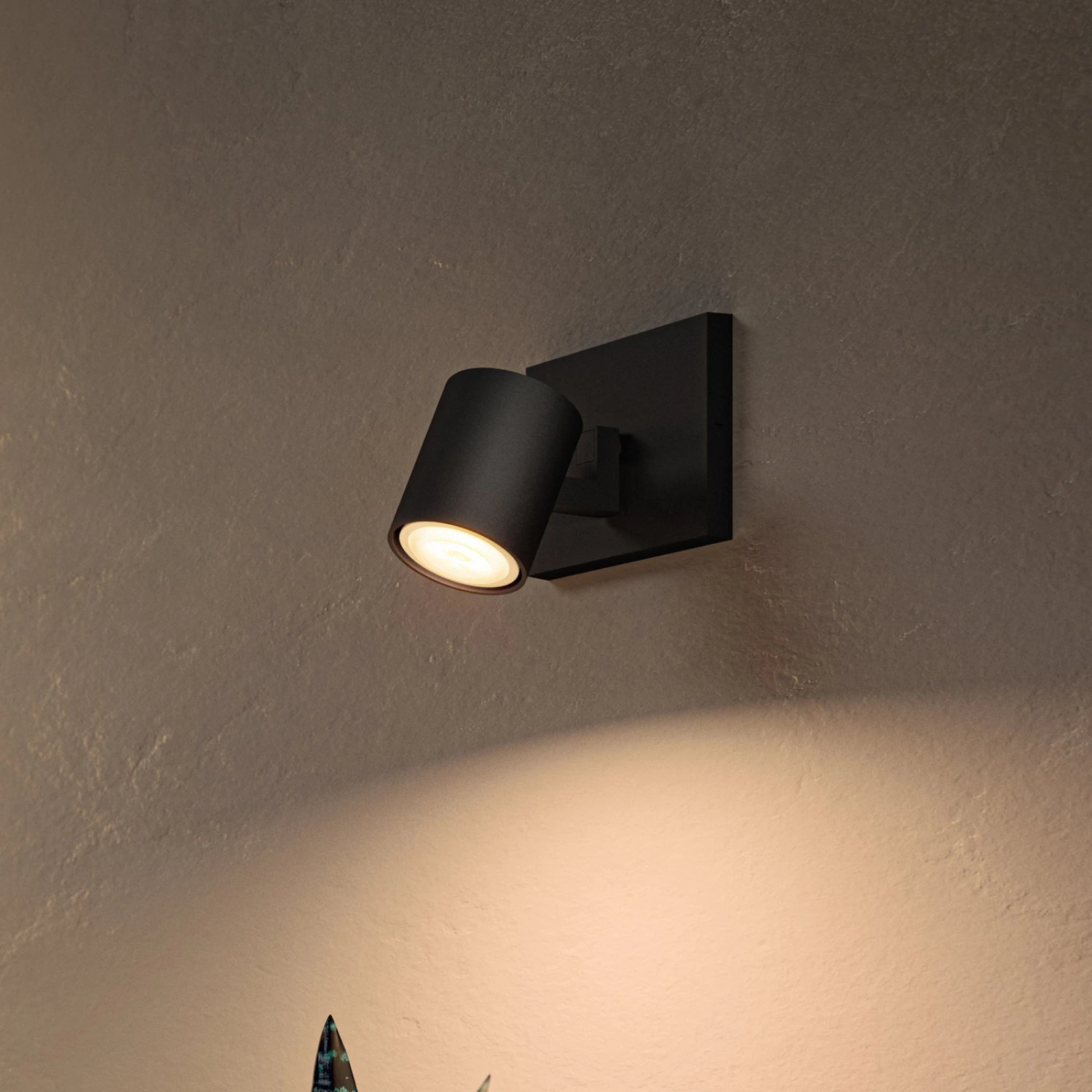 Il faretto a LED Philips Hue Runner è realizzato in alluminio resistente ed è rifinito con una laccatura finale di colore nero. Il telaio e il piccolo braccio della lampada, a cui è fissata la testa della lampada girevole, sono di forma quadrata, mentre la testa della lampada girevole è di forma cilindrica. All’interno della testa dell’apparecchio è presente una lampadina a LED Philips Hue White Ambiance GU10 sostituibile, che fornisce una luce sufficiente e, con l’aiuto dell’innovativa tecnologia ZigBee, consente il collegamento a un sistema Philips Hue Smart Home già esistente.