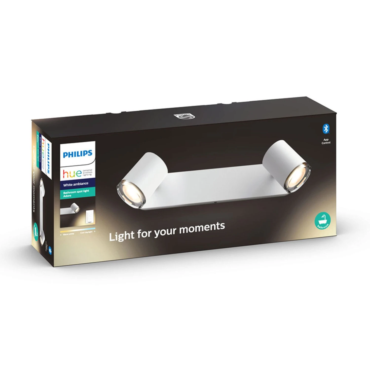 L’atmosfera giusta per ogni occasione è garantita dallo spot LED a due fiamme Adore, ideale per l’utilizzo in bagno grazie al grado di protezione IP44. Può essere controllato in due modi diversi, sia tramite l’interruttore dimmer Hue incluso nella fornitura, sia tramite un’applicazione Hue con il tablet o lo smartphone, in quanto può anche essere collegato al proprio sistema Hue. L’interruttore dimmer può essere utilizzato per commutare la luce in quattro scene predefinite, creando l’ambiente giusto per ogni attività nel bagno. Che si tratti di luce calda e soffusa per il relax o di luce fresca e brillante per il trucco e il risveglio.