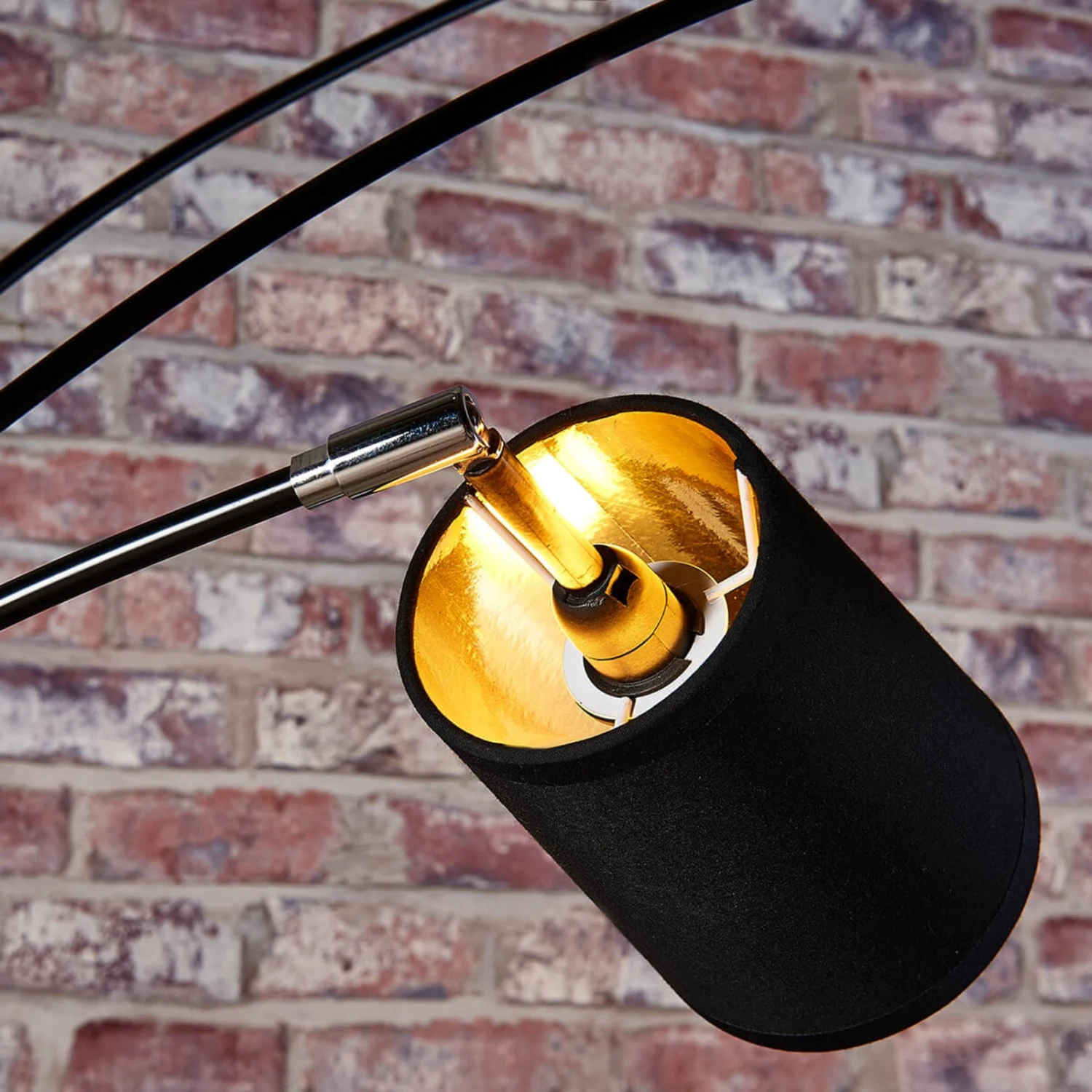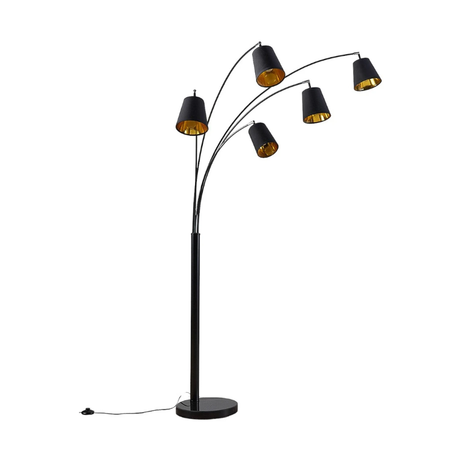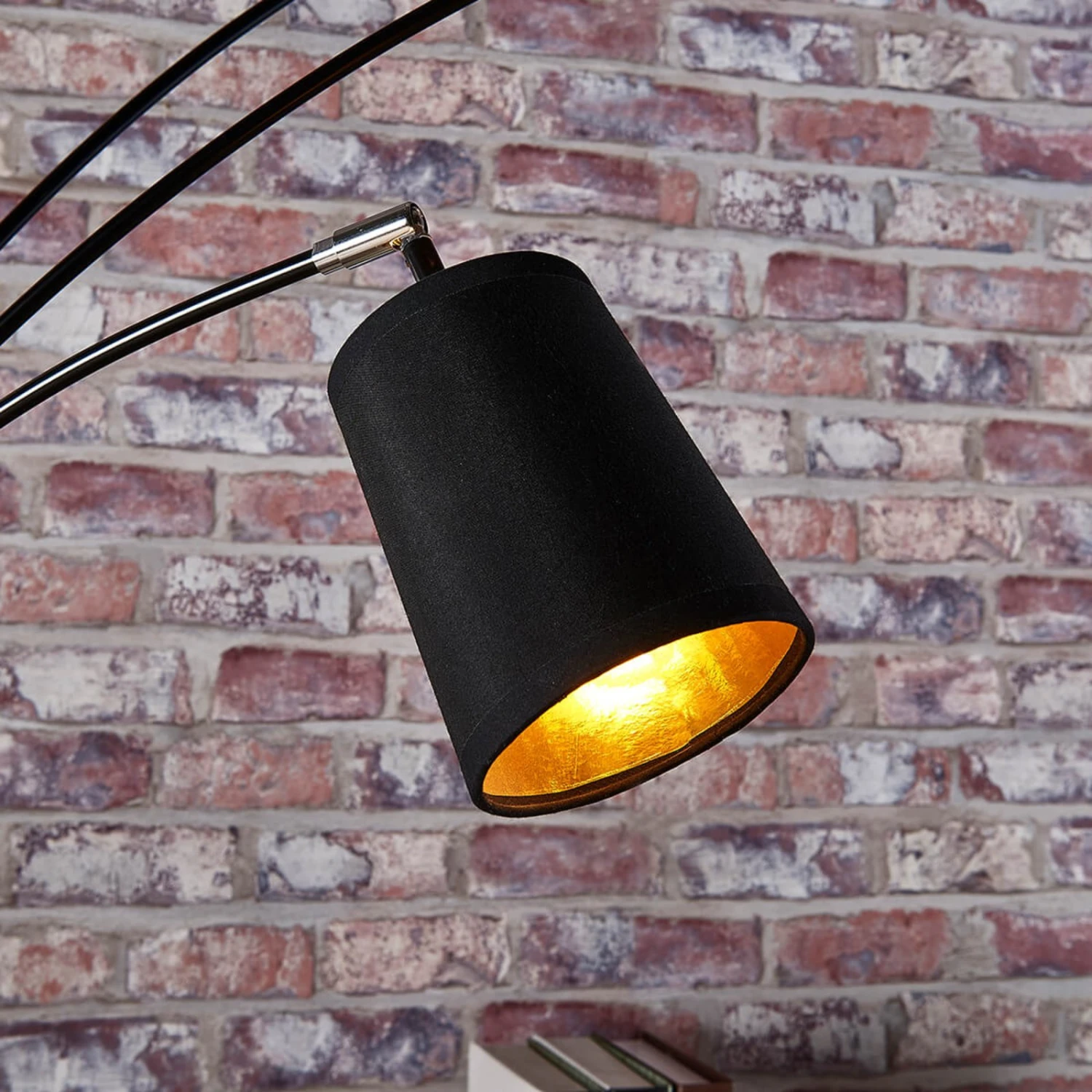 Lampada da terra tessile nero-oro Tinne con 5 paralumi moderniLa lampada da terra tessile Tinne offre puro comfort con i suoi paralumi color oro all’interno, perché l’oro è un colore che difficilmente può essere superato in termini di calda luminosità. Inoltre, riflette la luce in modo caldo e invitante. Allo stesso tempo, la lampada da terra ha un’accattivante forma ad arco e i singoli bracci sporgono nella stanza in misura diversa. Ogni paralume può essere leggermente regolato grazie a un giunto, in modo da poter adattare la luce alla situazione in loco. Per una maggiore stabilità, la stabile base è realizzata in marmo pesante e il cavo di alimentazione contiene anche l’interruttore, che può essere facilmente azionato con il piede. Nella zona giorno, un complemento squisito con un’espressione elegante e un bellissimo effetto luminoso!