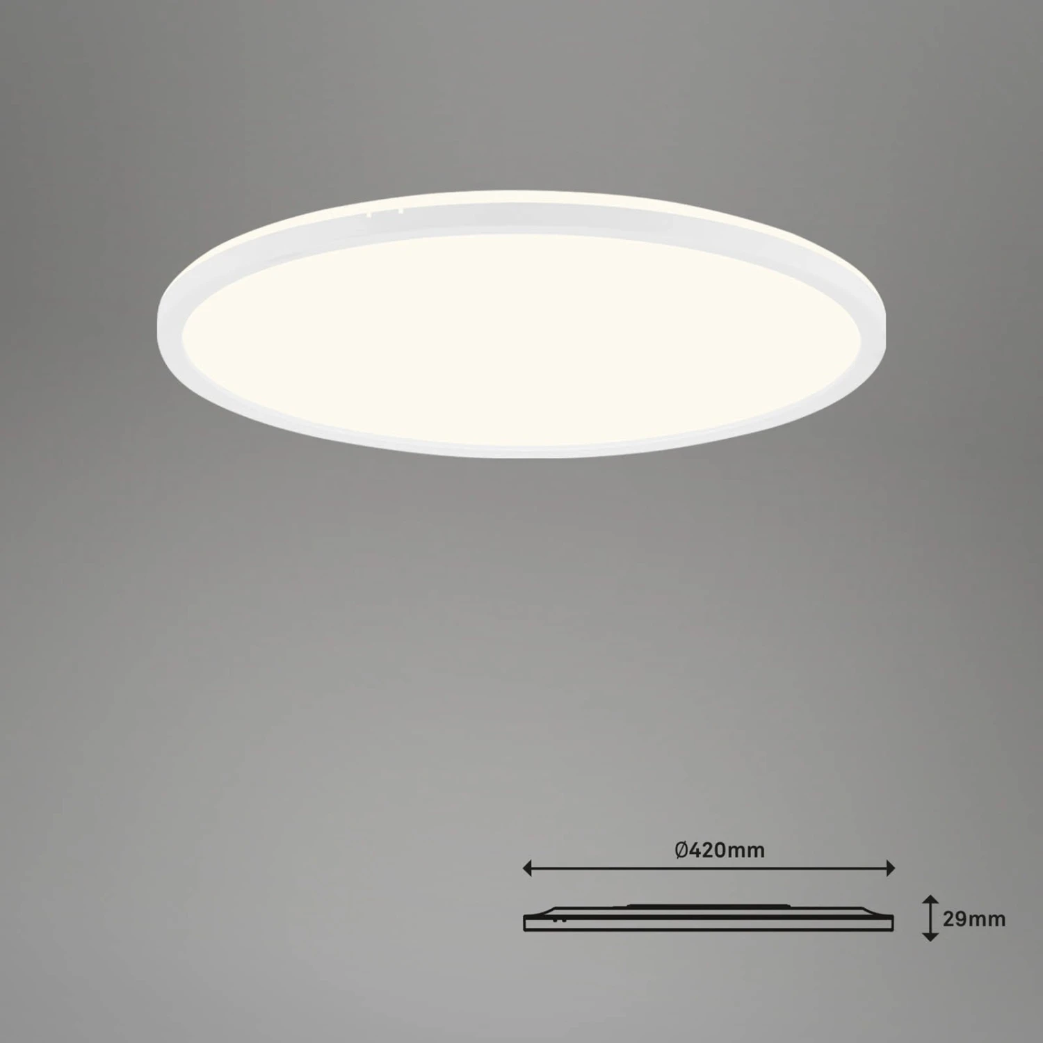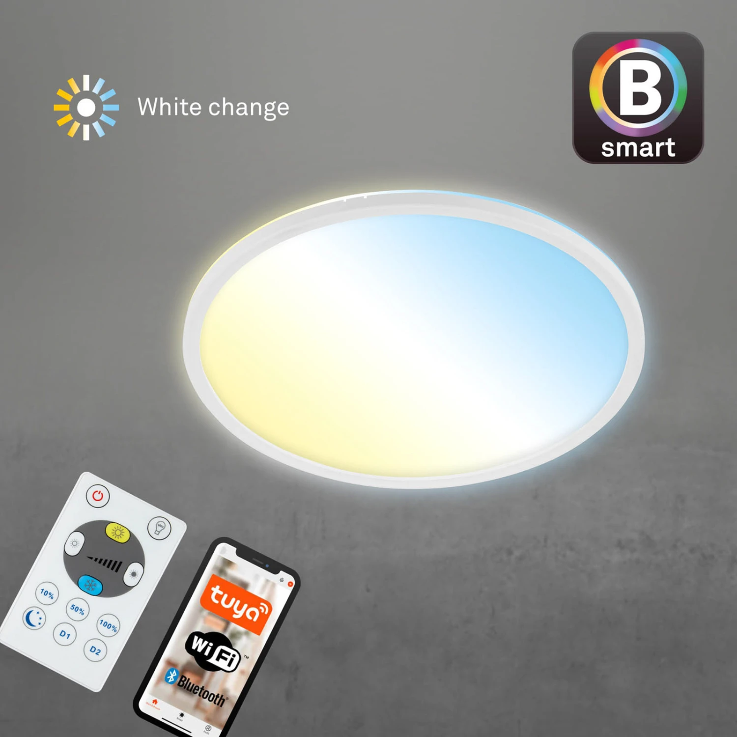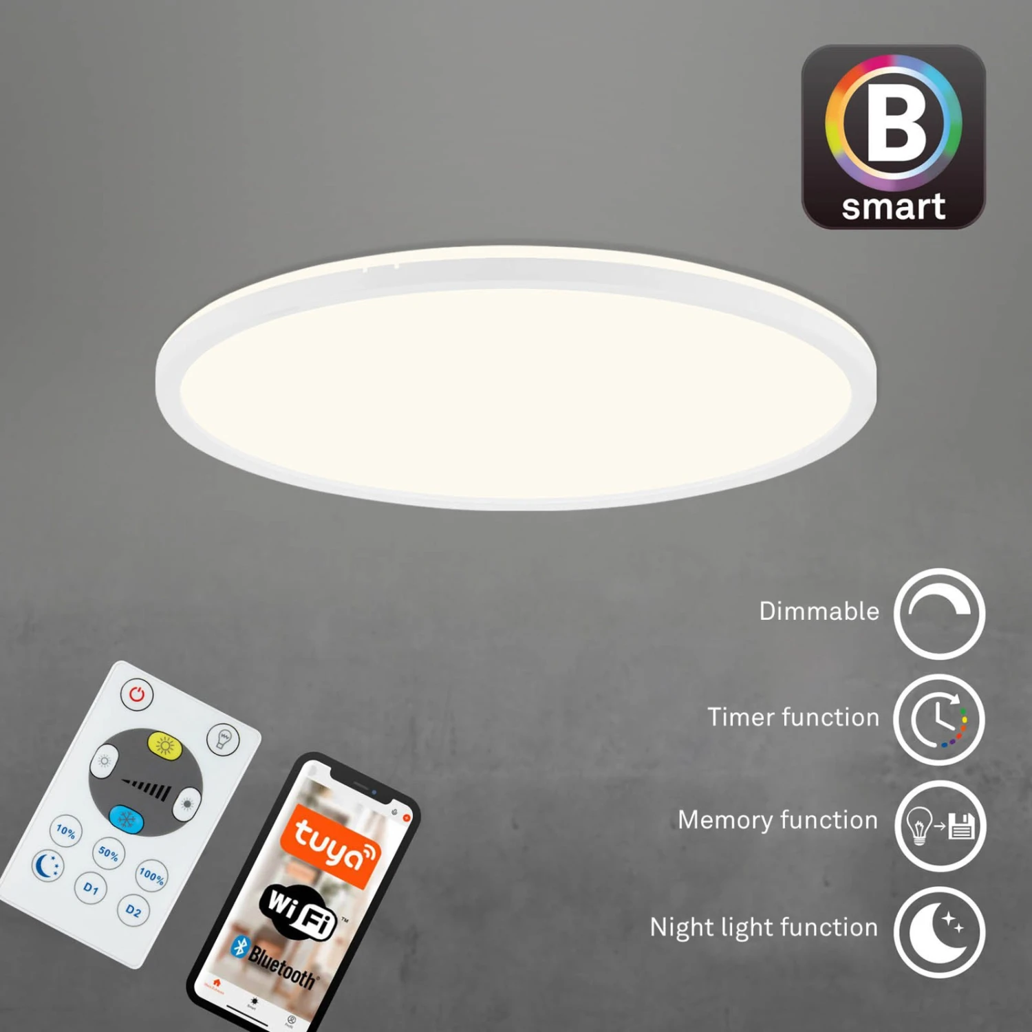 Apparecchio da soffitto a LED bianco Slim S con funzione di dimmerazione e CCTSemplice e senza tempo, l’apparecchio da soffitto a LED Slim S, con la sua colorazione bianca e la sua forma rotonda, si integra perfettamente in diversi ambienti e stili di interni esistenti. La luce principale si dirige verso il pavimento, mentre una piccola parte si dirige anche verso il soffitto, creando un effetto decorativo di retroilluminazione. Slim S può essere utilizzato, ad esempio, come fonte di luce in corridoio, in soggiorno, in cucina o in camera da letto. L’apparecchio a soffitto a LED è dotato di una funzione CCT che consente di modificare la temperatura del colore da bianco caldo a bianco luce diurna. Inoltre, è possibile regolare la luminosità dell’apparecchio. Inoltre, sono state installate una luce notturna, un timer e una funzione di memoria. Le singole funzioni si controllano con il telecomando in dotazione, tramite l’app gratuita tuya o con un comando vocale.- telecomando incluso- controllo tramite app tuya per iOS e Android- controllo vocale tramite Amazon Echo e Google Home- dimmerabile- funzione CCT (2.700 – 6.500 K)- timer integrato, luce notturna e funzione memoria