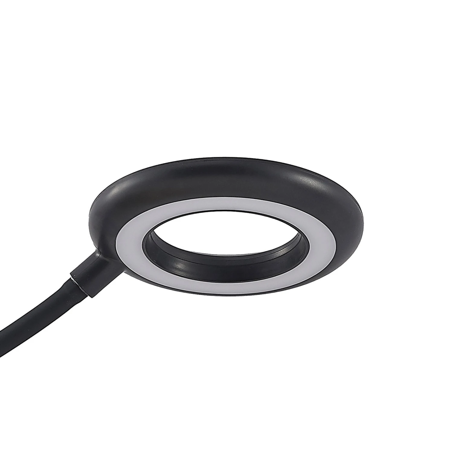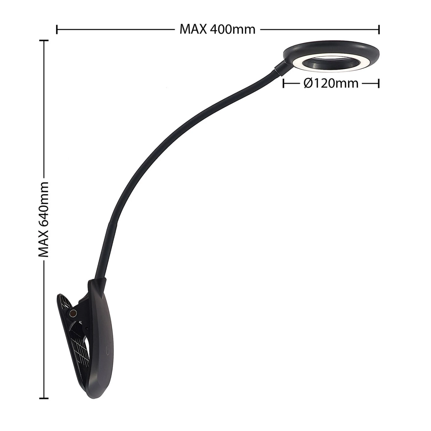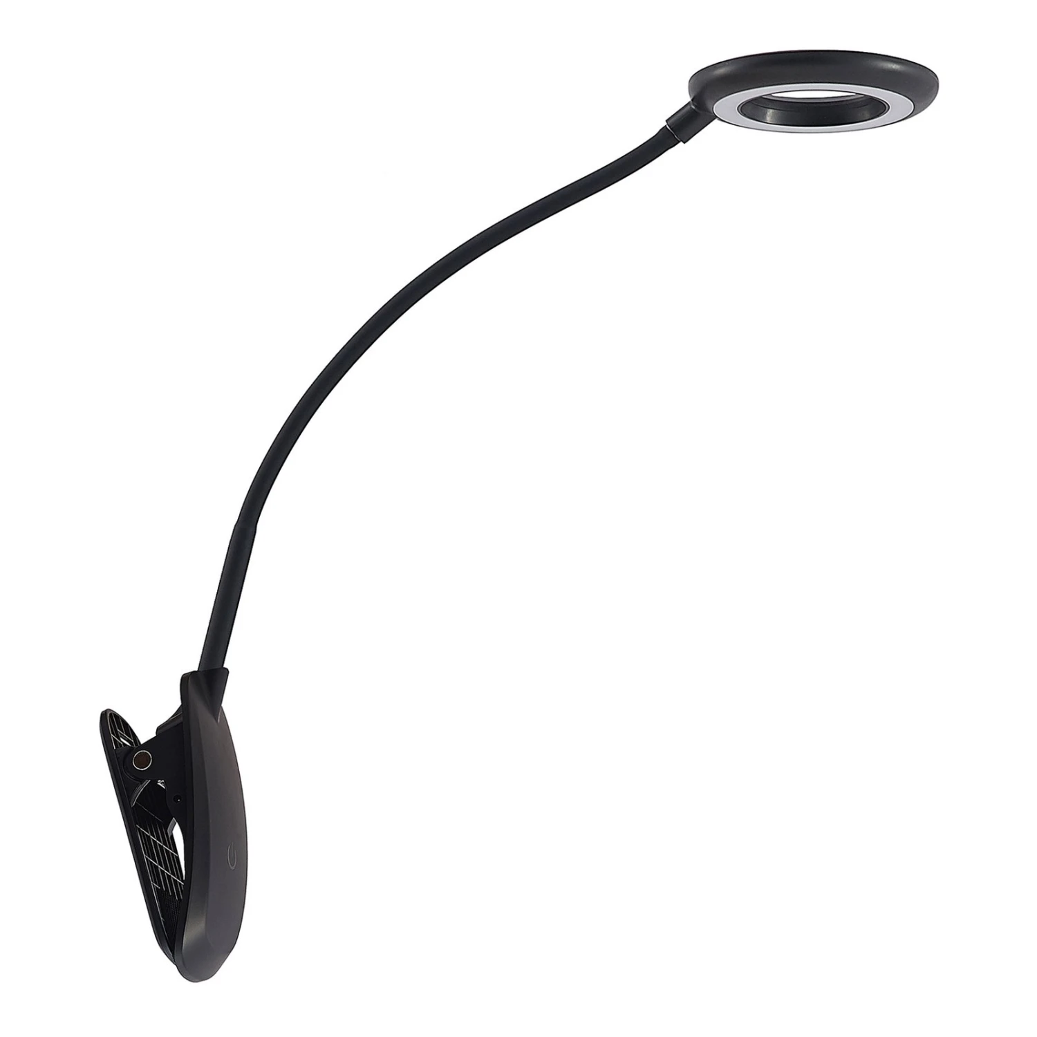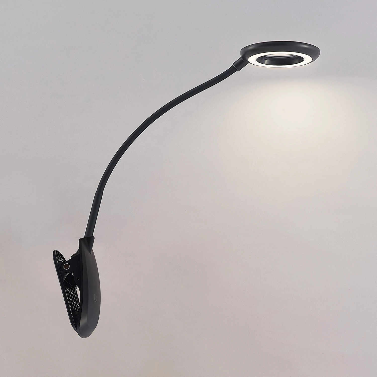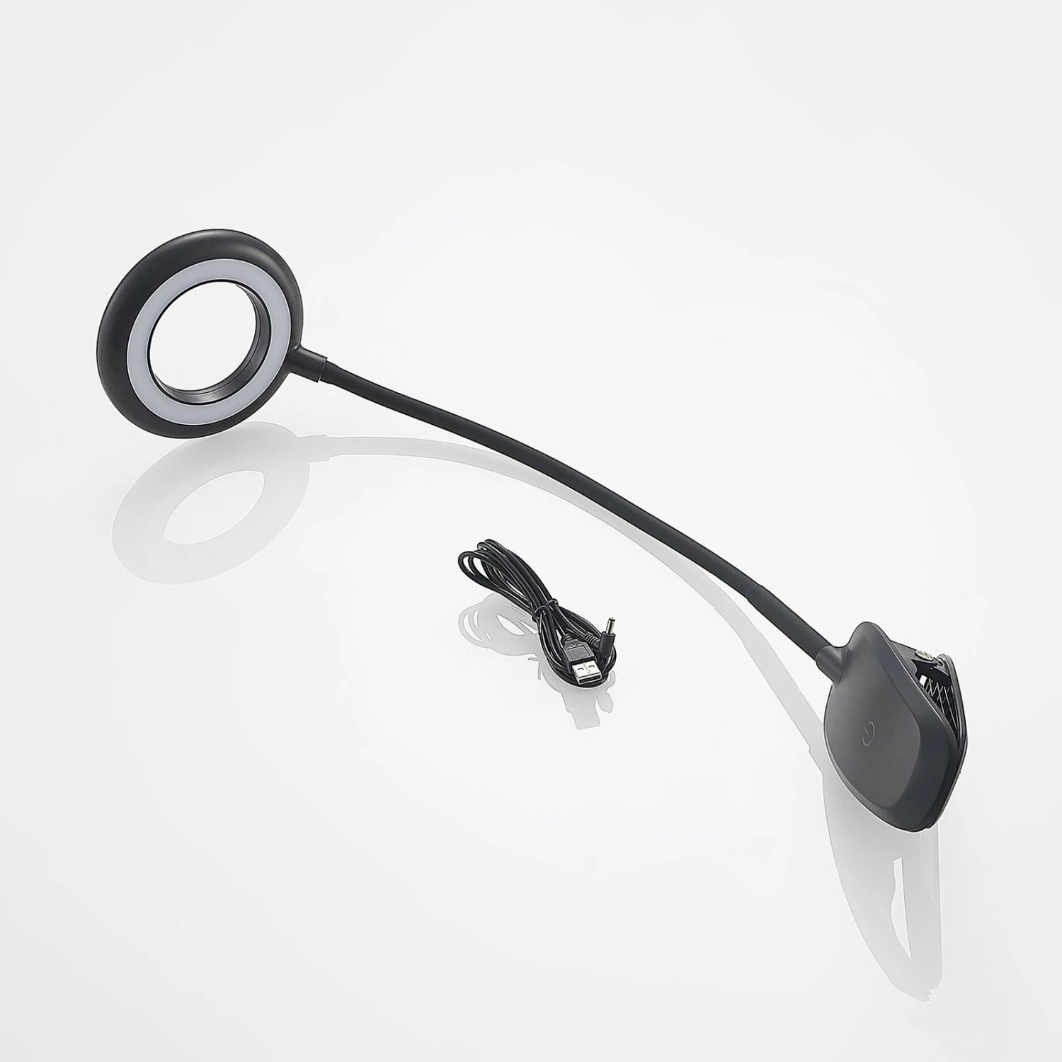 Lampada a morsetto LED Harumi dimmerabile all’infinito con braccio mobile Harumi è una piccola lampada a morsetto LED dotata di un’eccezionale tecnologia LED. La testa dell’apparecchio, a forma di anello, è dotata di potenti LED installati in modo permanente, la cui luminosità può essere regolata individualmente a seconda delle esigenze. Questa luce economica può essere ricaricata con un cavo USB e utilizzata ovunque sia necessario grazie al morsetto integrato.